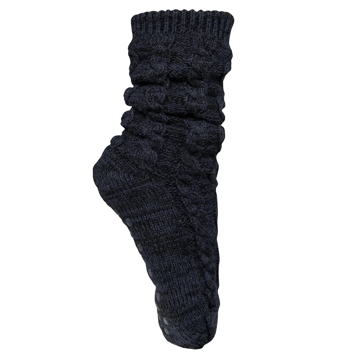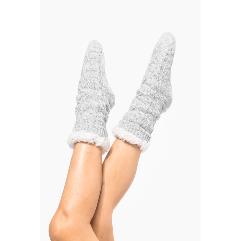 Exterieur : 100% acrylique. Intérieur : 100% polyester. Chaussettes d'intérieur chaudes doublées sherpa. Picots anti-glisse sous la semelle. Effet tricoté main avec maille torsadée. Hauteur 27 cm.