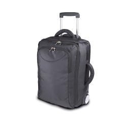 Trolley taille cabine en polyester 600D. Large compartiment central, poche frontale, zips avec rappel ton sur ton, picots de fond, poignée supérieure et de côté renforcées et matelassées. Les compartiments intérieurs sont recouverts d'une doublure en polyester noir avec des lacets pour maintenir les vêtements en place.