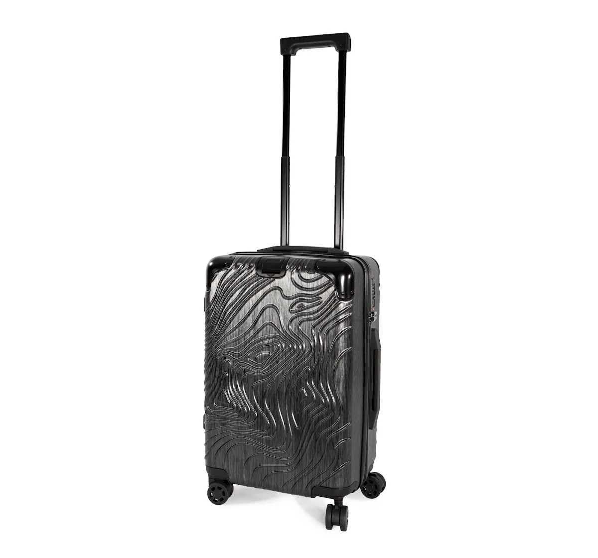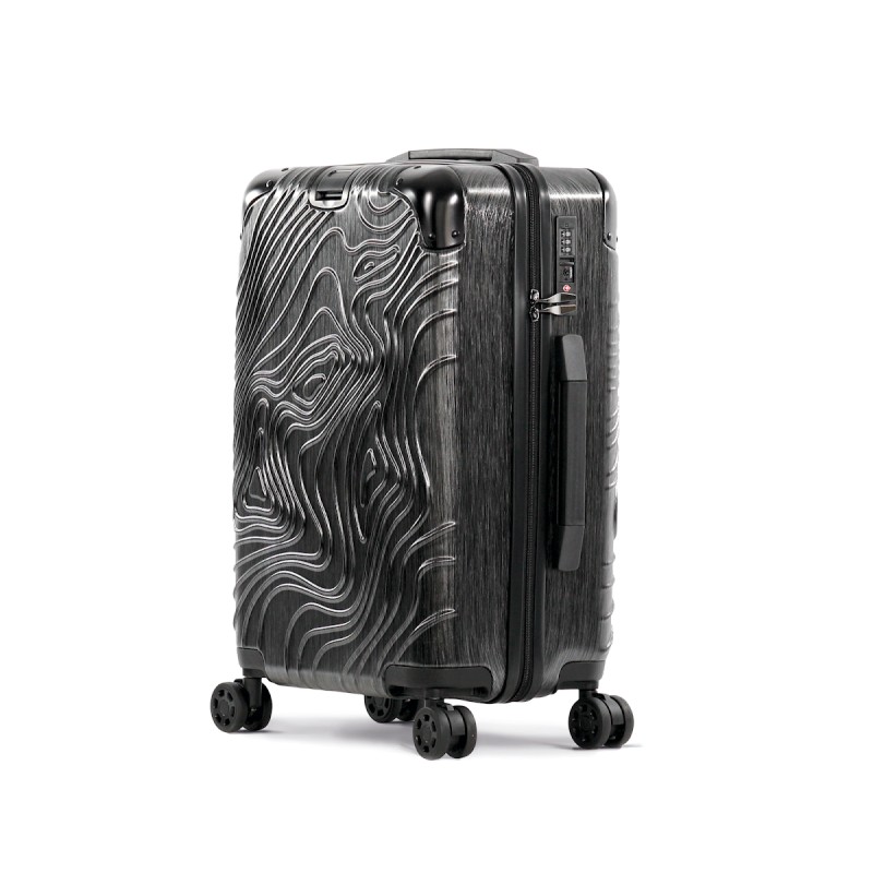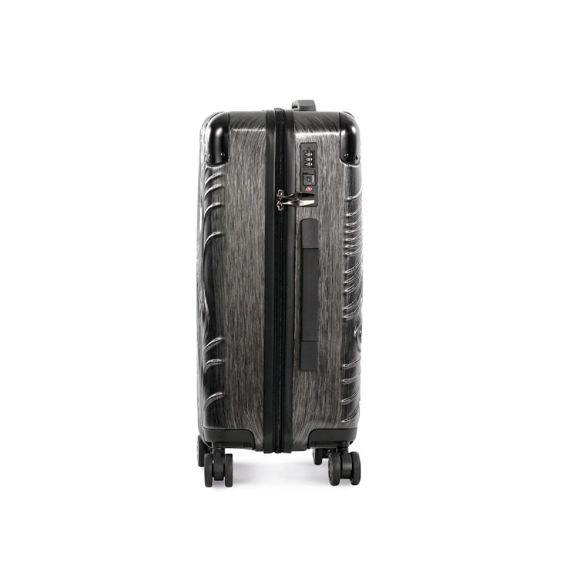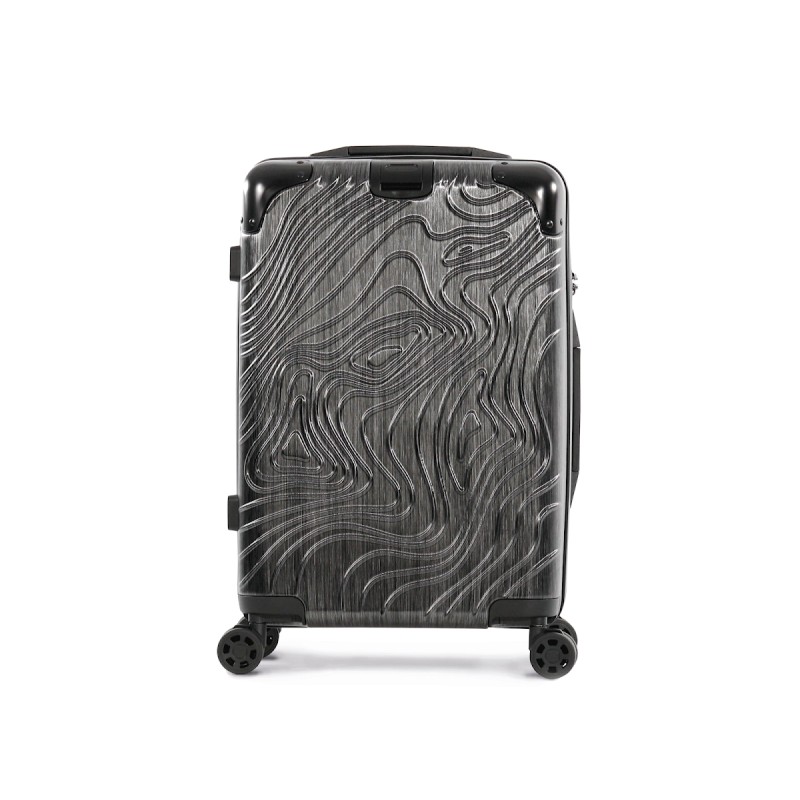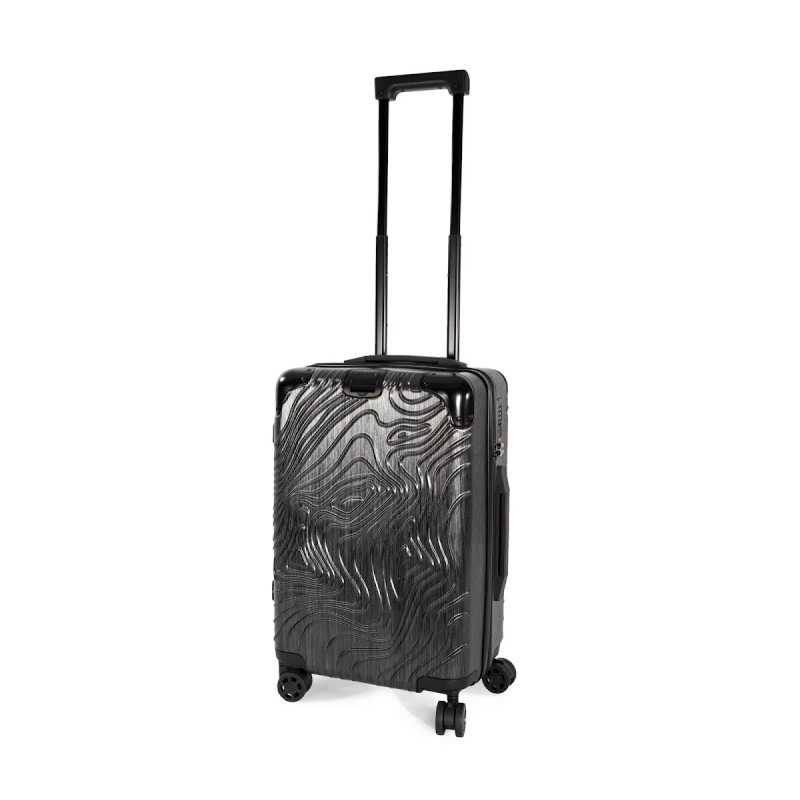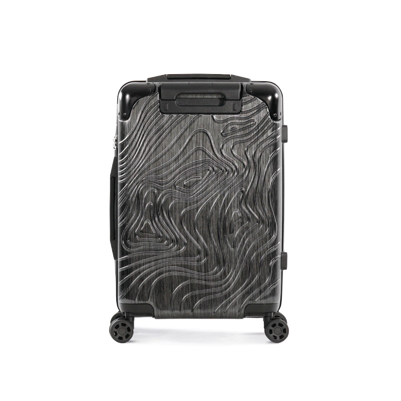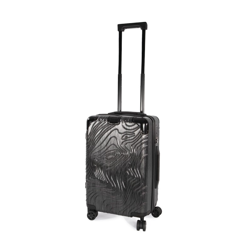 100% polycarbonate. Trolley taille cabine. Imaginé avec un design original représentant les reliefs du Pic de l'Aneto dans les Pyrénées, ce trolley en aluminium est doté de 4 roues multidirectionnelles et de pieds de protection latéraux pour poser la valise sur le côté. Les angles sont réalisés en matériaux en caoutchouc pour une meilleure protection. Pour plus de confort il comporte : une poignée supérieure extensible et une poignée sur le côté, une sangle rétractable sur le devant pour accrocher et transporter une sacoche porte document, deux compartiments internes dont un avec une sangle de maintien et un autre avec une fermeture glissière et poches pour accessoires. Pour votre sécurité, ce trolley est équipé d'une fermeture par TSA par combinaison.