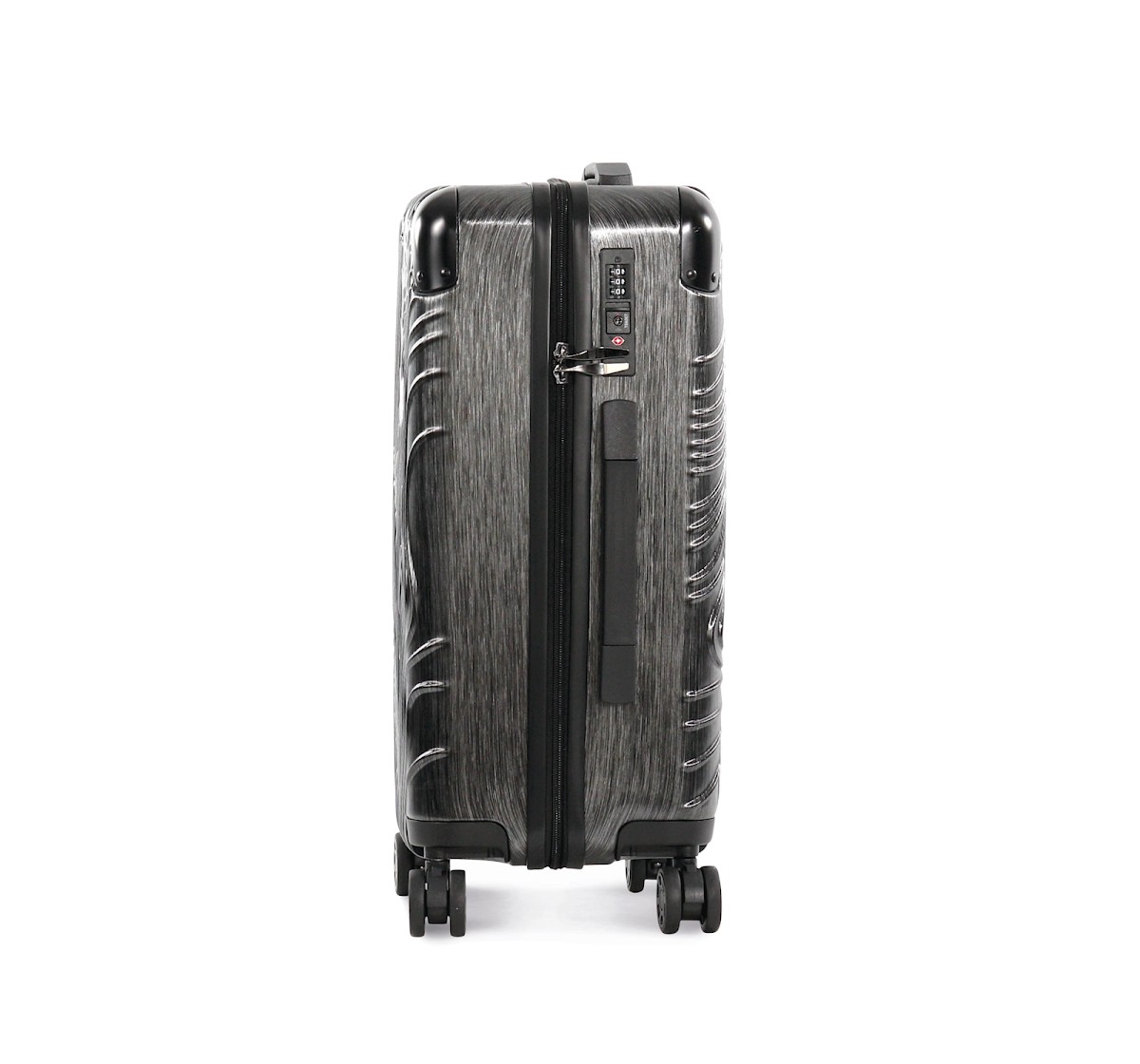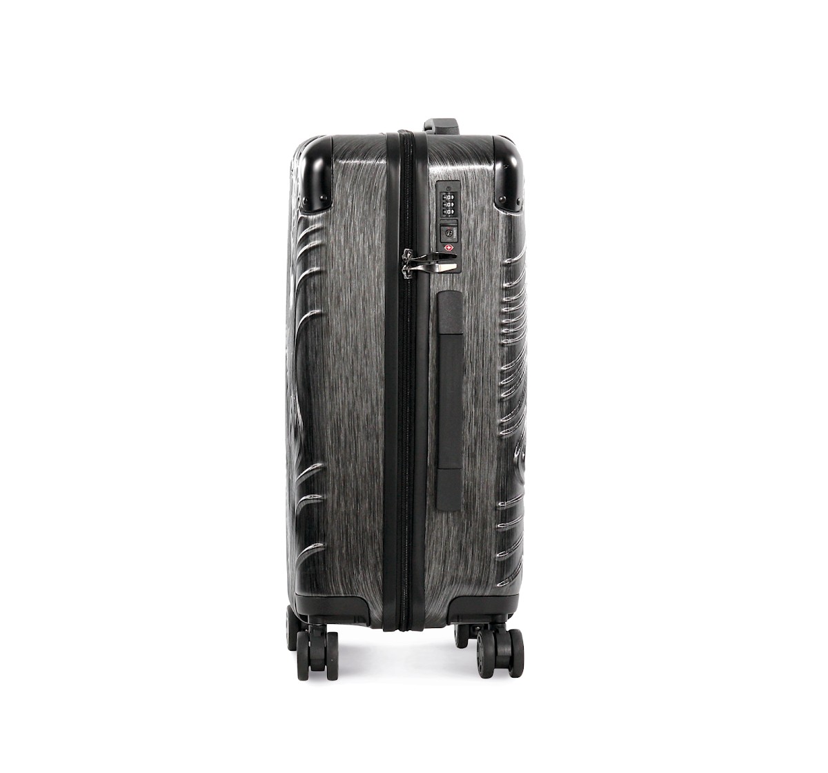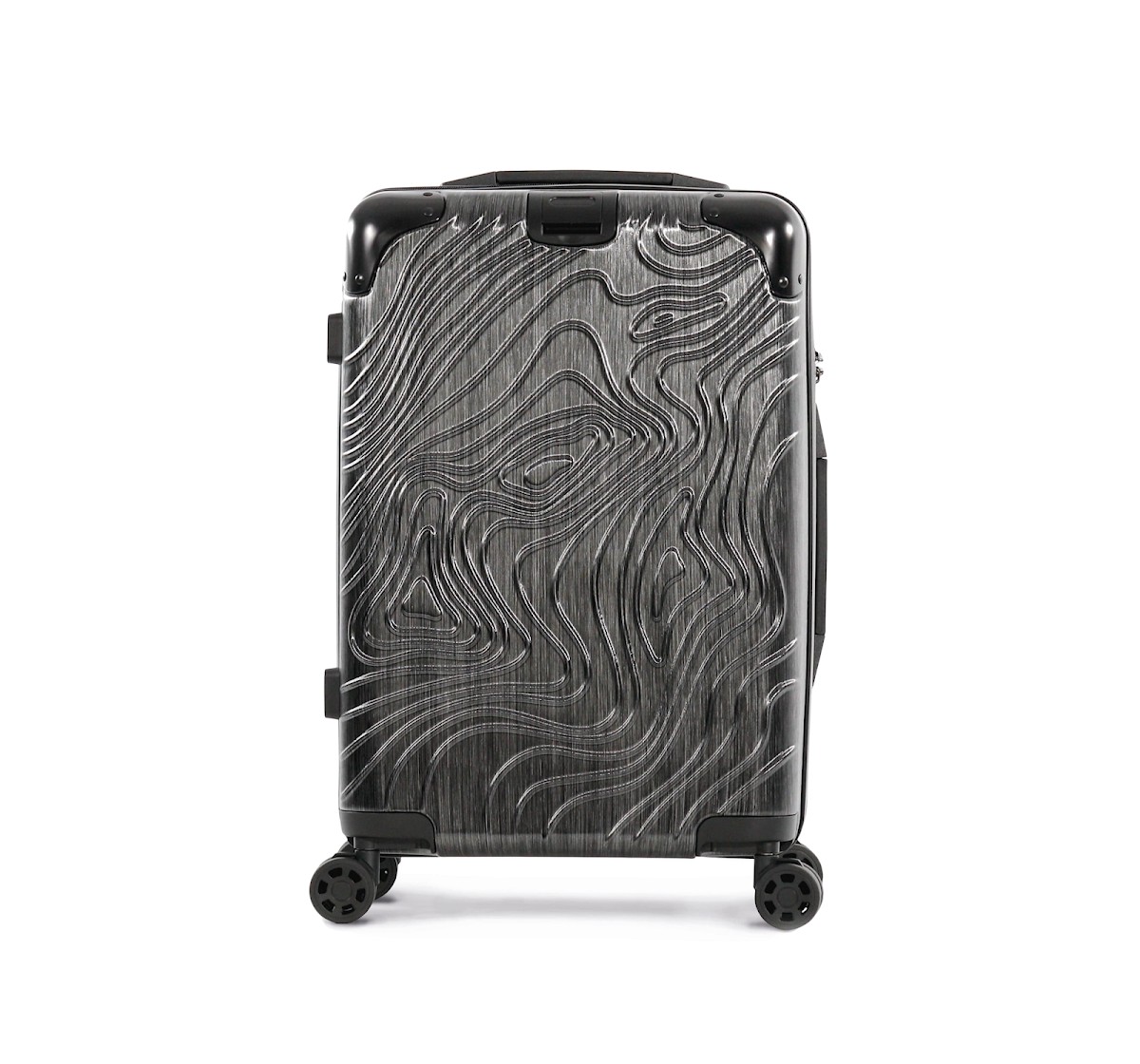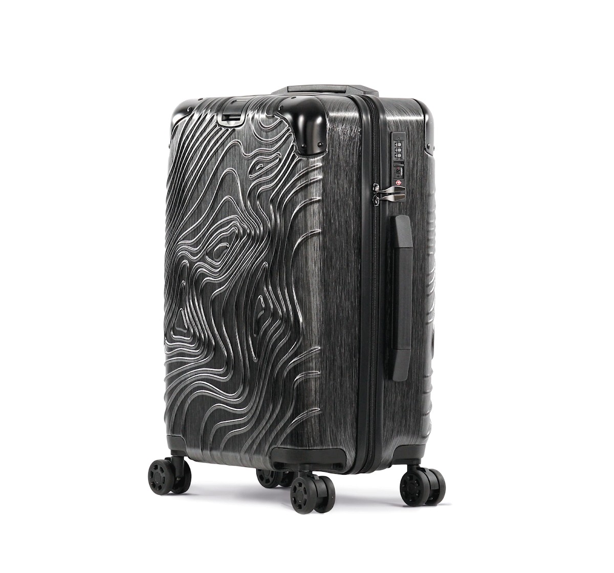 100% polycarbonate. Trolley taille cabine. Imaginé avec un design original représentant les reliefs du Pic de l'Aneto dans les Pyrénées, ce trolley en aluminium est doté de 4 roues multidirectionnelles et de pieds de protection latéraux pour poser la valise sur le côté. Les angles sont réalisés en matériaux en caoutchouc pour une meilleure protection. Pour plus de confort il comporte : une poignée supérieure extensible et une poignée sur le côté, une sangle rétractable sur le devant pour accrocher et transporter une sacoche porte document, deux compartiments internes dont un avec une sangle de maintien et un autre avec une fermeture glissière et poches pour accessoires. Pour votre sécurité, ce trolley est équipé d'une fermeture par TSA par combinaison.