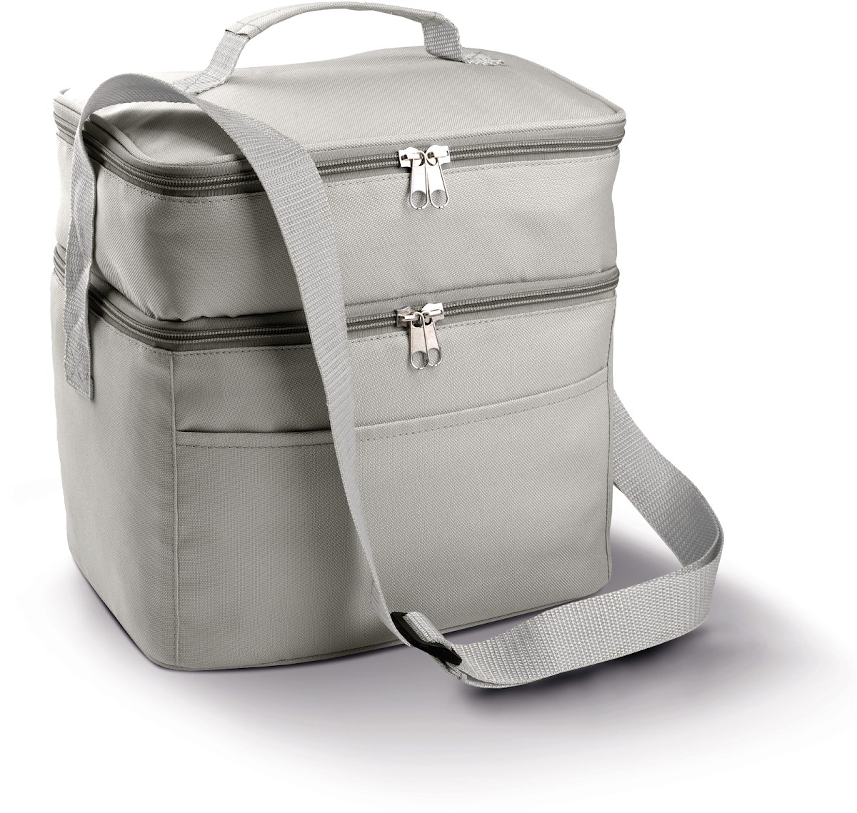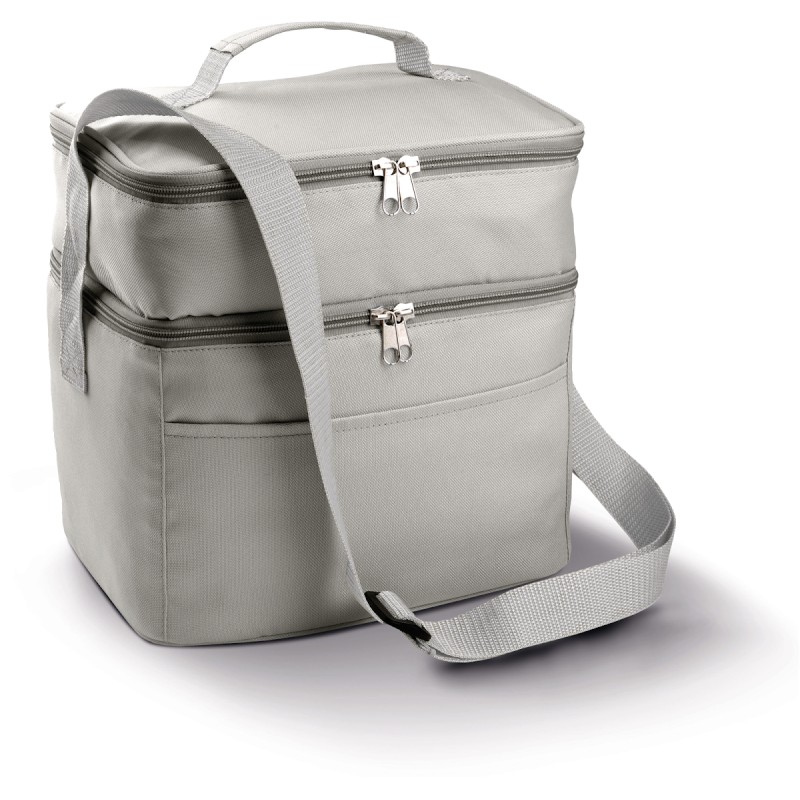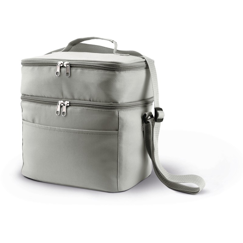 Sac isotherme à double compartiment, polyester 600D, large poche devant, sangle d'épaule ajustable.