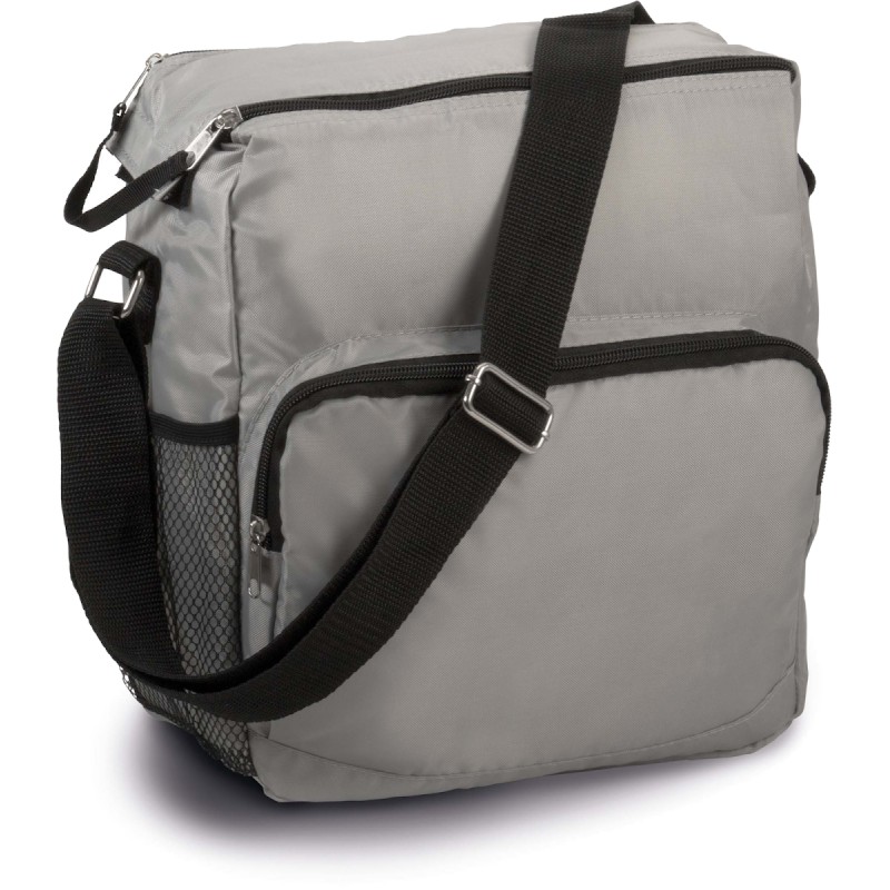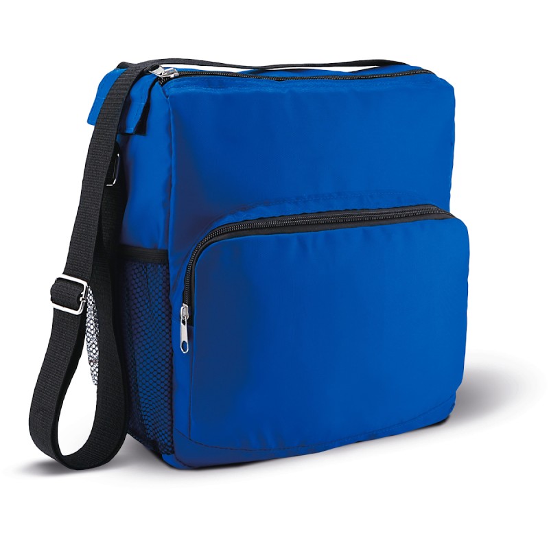 Sac isotherme vertical en polyester 420D, grande poche zippée devant, poche côté en filet, sangle d'épaule ajustable.