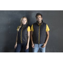 Grand zip avec une poche intérieure gauche pour marquage. Possibilité de ranger totalement le bodywarmer dans la poche intérieure droite avec fermeture Velcro®. 2 poches latérales zippées avec rabat.