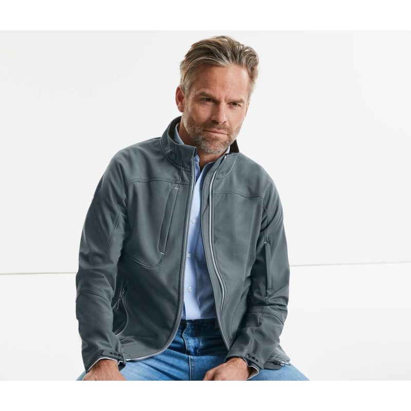 Softshell 3 couches 94% polyester / 6% élasthanne avec finition DWR Bionic-Finish® Eco. Innovation matière haute performance, sans fluor ni PFC, avec membrane hydrophobe 5000 mm, coupe-vent et respirante 5000 g/m²/24h. Zips et détails contrastés. Protège-menton. Col montant et rabat-tempête intérieur. Empiècements aérés hydroshell sous les bras. Doublure avant en jersey alvéolé avec une grande poche média en filet. Poches zippées avec rabat : 1 sur la poitrine et 1 sur la manche. Poignets ajustables avec languettes intégrées et bande velcro. Épaules sans couture. Zip intérieur pour accès personnalisation.