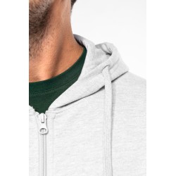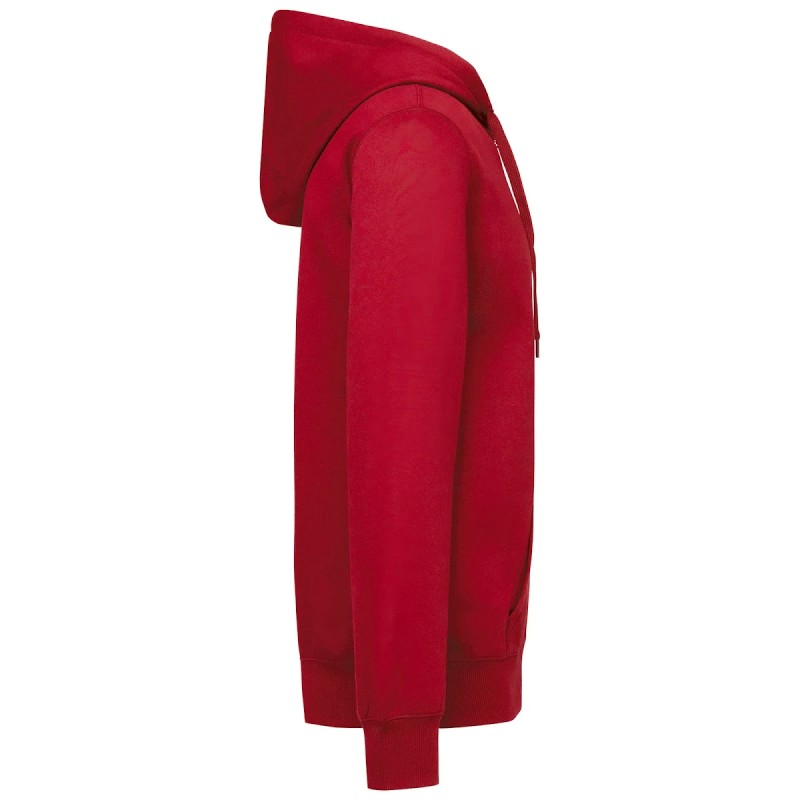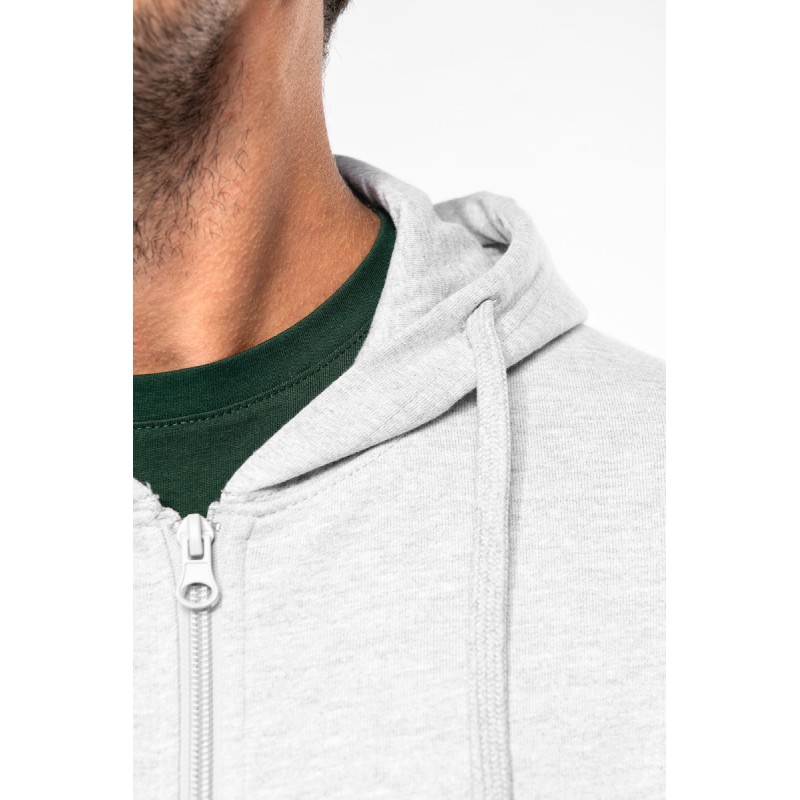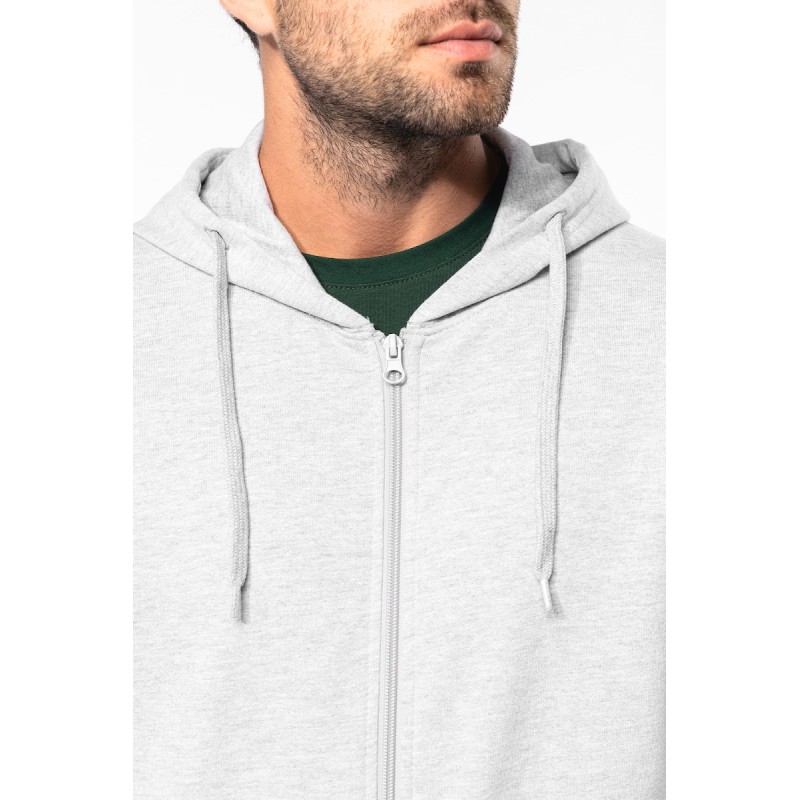 50% coton ring-spun / 50% polyester recyclé post consumer. Molleton gratté. Coupe straight. Coupé cousu. Bord-côte 2x1 montage tubulaire pour une meilleure finition au col, bas de manches et de vêtement. Poche kangourou. Zip de fermeture en nylon. Capuche doublée polycoton jersey avec cordon de serrage plat. Bande de propreté jersey ton sur ton à l'intérieur du col. Pas d'étiquette de marque au col, uniquement une puce de taille pour faciliter la personnalisation.