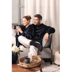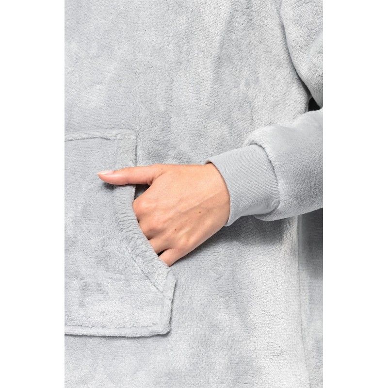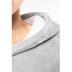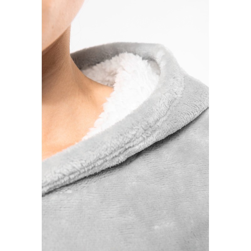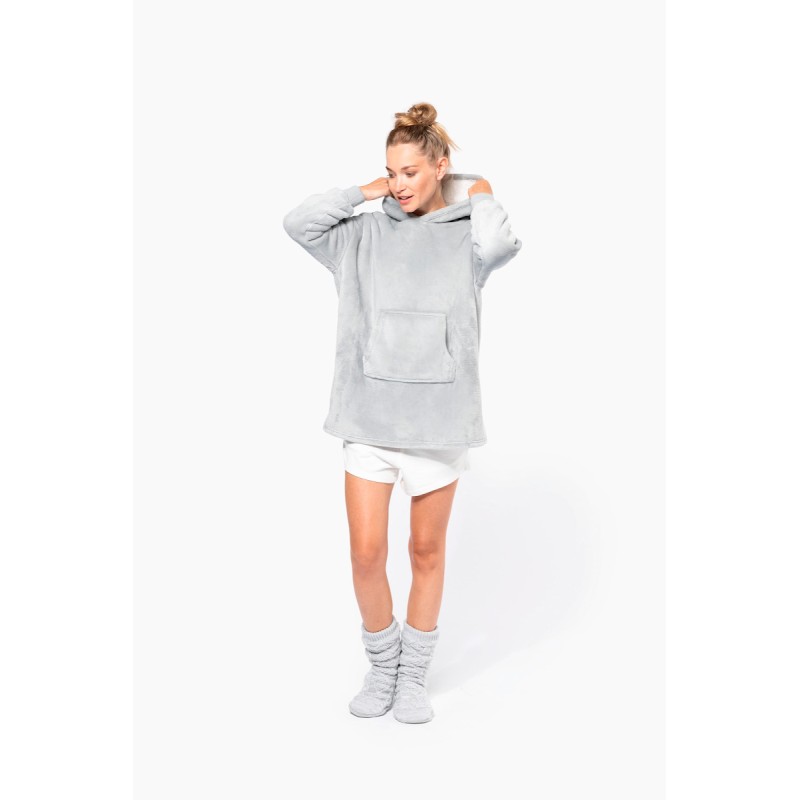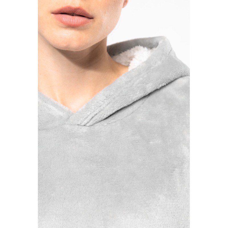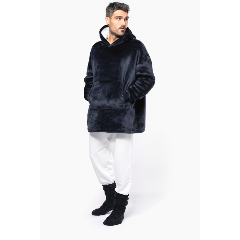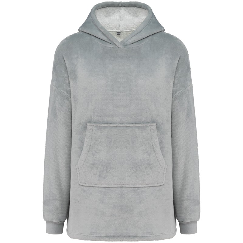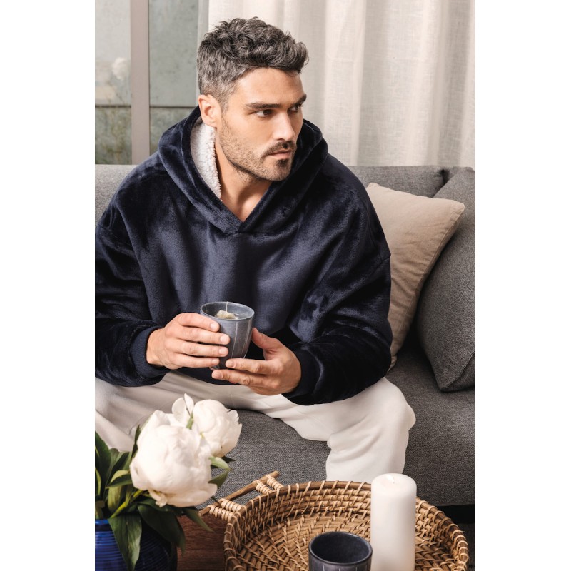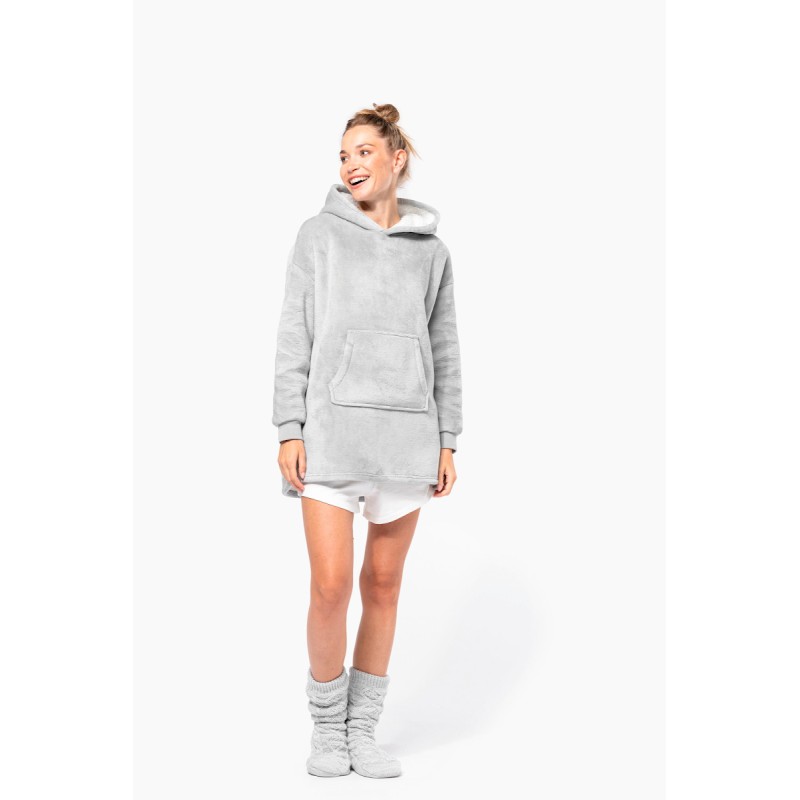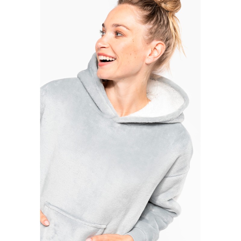 100% polyester. Coupe oversize aux épaules tombantes. Tissu double face, extérieur velours avec intérieur sherpa. Capuche croisée devant en deux panneaux avec finitions double surpiqûres. Manches longues avec poignet bord côte 1x1. Présence d'élasthanne dans le bord côte bas de manche pour éviter que le poignet ne se déforme. Poche kangourou. Finition bas de vêtement double surpiqûres. Pas d'étiquette de marque au col, uniquement une puce de taille pour faciliter la personnalisation.