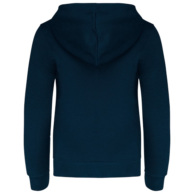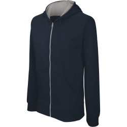 80% coton / 20% polyester. Coton peigné. Molleton gratté. Bord-côte bas de manches et de vêtement. Capuche doublée et contrastée. Zip contrasté. Passe-fils écouteurs dans la poche kangourou et encolure.