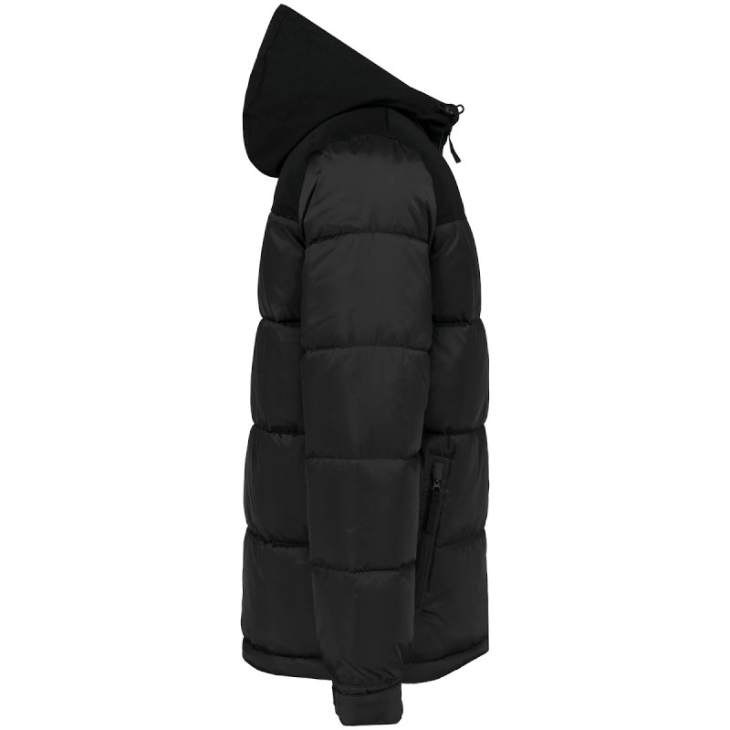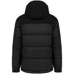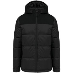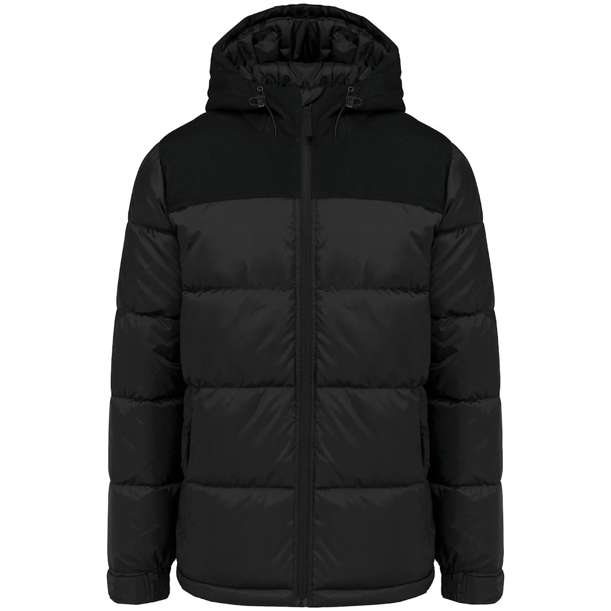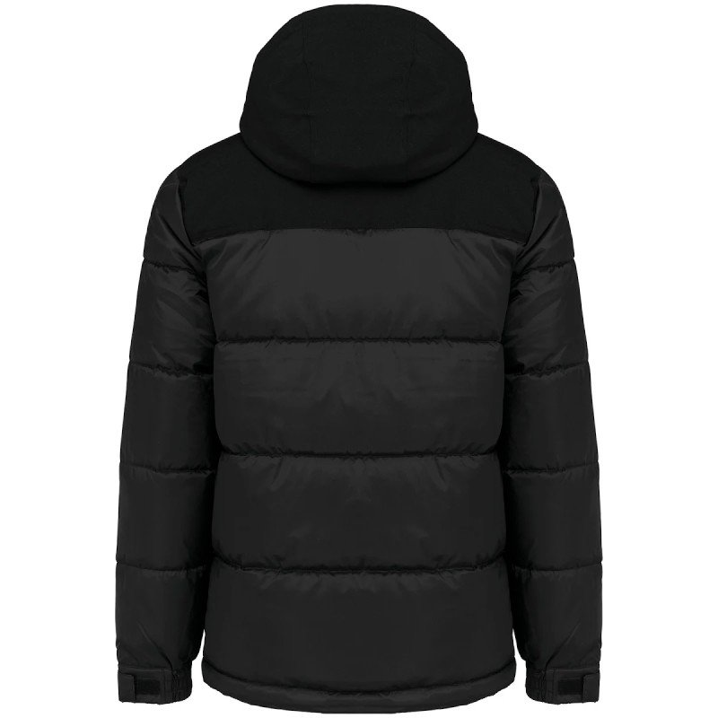 Tissu principal : 100% polyamide 210T. Partie supérieure devant et dos : polyamide Taslon 500D. Tissu antistatique et déperlant. Doublure 100% polyester taffetas. Rembourrage 100% polyester. 2 poches zippées devant côtés avec zip inversé et tire-zip. Capuche : polyamide Talson 500D, matelassée et doublée en 3 parties avec cordon de serrage et stoppeur. Poche intérieure avec fermeture par bande auto-agrippante. Bas de manches élastiqué avec bande auto-agrippante. Ourlet avec lien de serrage et stoppeurs aux côtés sur le bas de vêtement. Zip invisible de personnalisation intérieur dos et intérieur poitrine. Pas d'étiquette de marque, uniquement une puce de taille pour faciliter la personnalisation. Garnissage injecté : le grammage peut varier selon les zones du vêtement. Le poids total est indicatif.