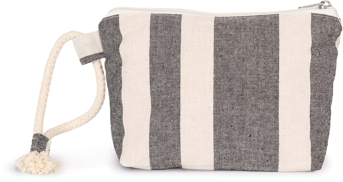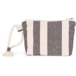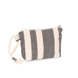 67% coton recyclé / 30% polyester recyclé / 3% autres fibres. La pochette est doublée par un tissu contrasté et possède une fermeture zippée. La pochette est dotée d'une sangle en corde de coton. Le motif rayé est inspiré des skylines des grandes villes métropolitaines. Le tissage jacquard confère un aspect unique à chaque pièce.