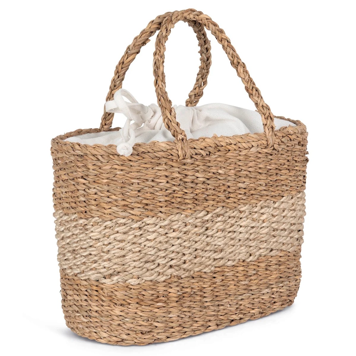 Mélange jute et jonc de mer. ONE SIZE (21 x 38 x 25,5cm). Capacité : 21L. Ce produit est tressé à la main à partir de fibres végétales de jonc de mer et de jute. Doublure intérieure couleur Ecume en fil cyclo conçue à partir de 70% coton recyclé, 28% polyester recyclé et 2% autres. Fermeture par lien coulissant de serrage. Anses au tressage rond. Ce panier est issu d’une collaboration avec la société HandTouch, membre d’ECOTA : organisation pour le commerce équitable au Bangladesh contribuant à une économie plus durable.