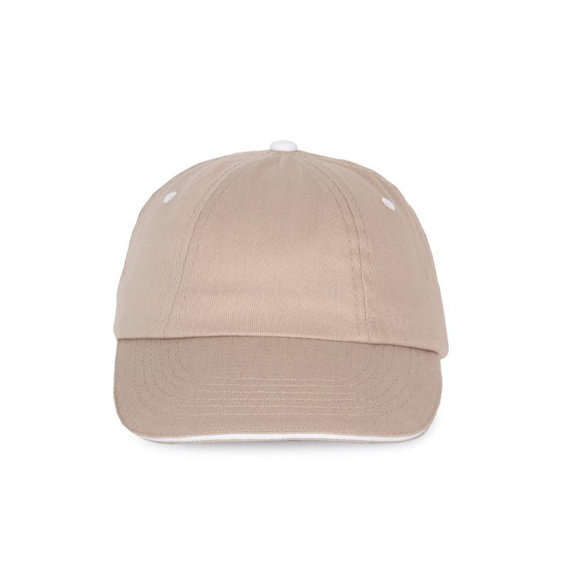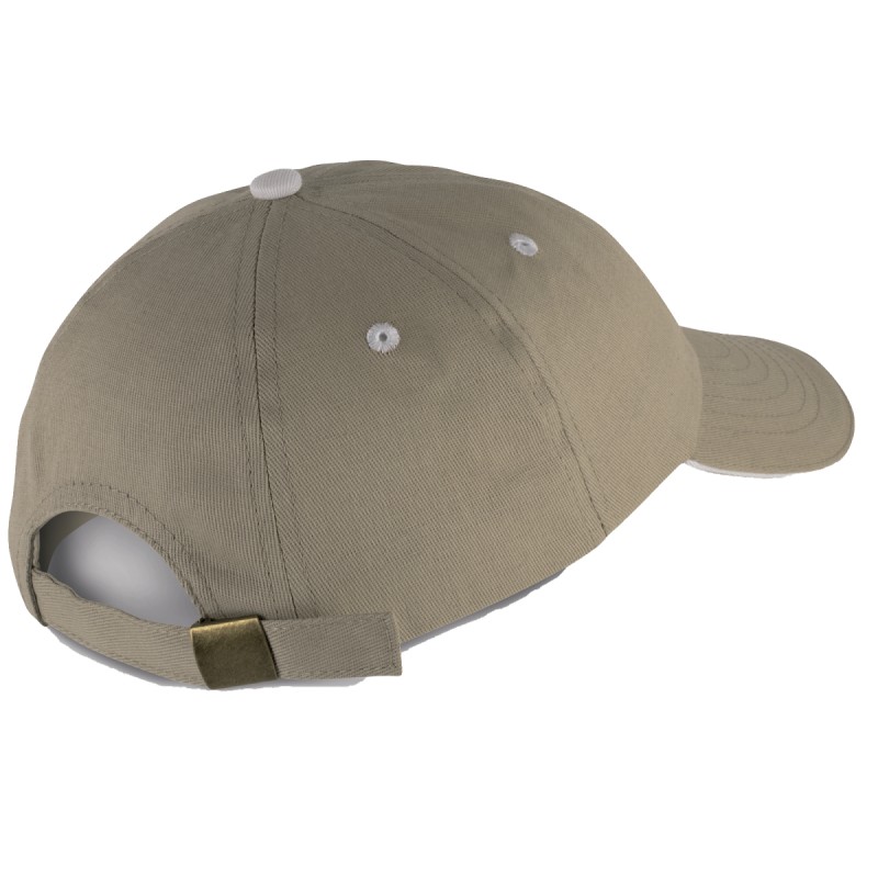 100% coton sergé. Panneau frontal pour faciliter la personnalisation. Tranche de la visière de couleur contrastée. Fermeture arrière réglable par boucle métallique.