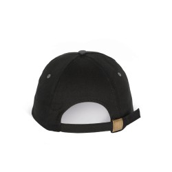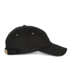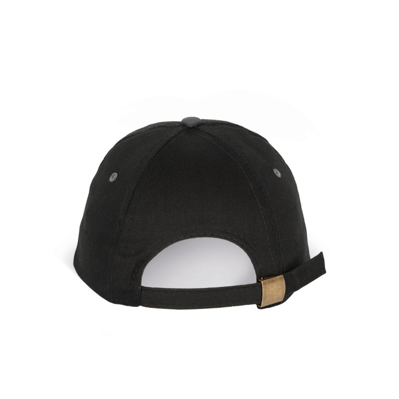 100% coton sergé. Panneau frontal pour faciliter la personnalisation. Tranche de la visière de couleur contrastée. Fermeture arrière réglable par boucle métallique.