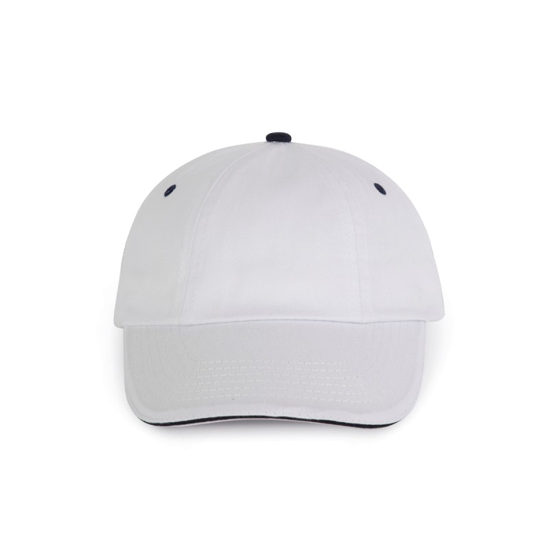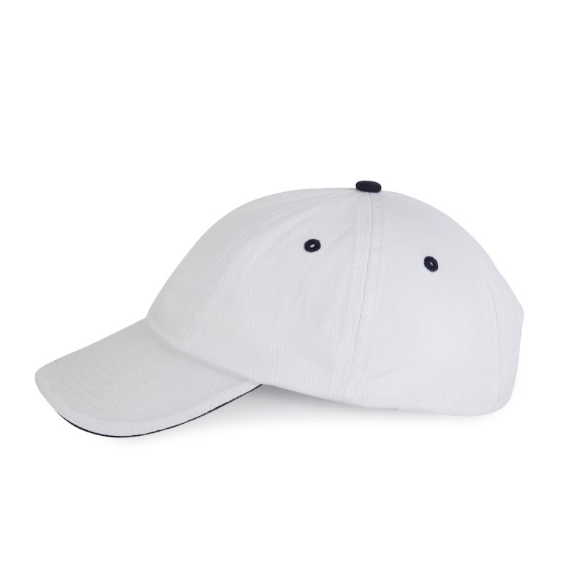 100% coton sergé. Panneau frontal pour faciliter la personnalisation. Tranche de la visière de couleur contrastée. Fermeture arrière réglable par boucle métallique.