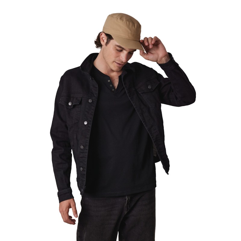 100% coton canvas. Fermeture arrière réglable par bande auto-agrippante.