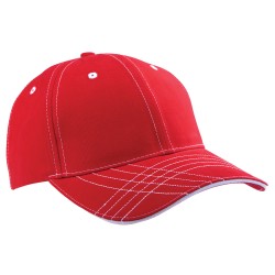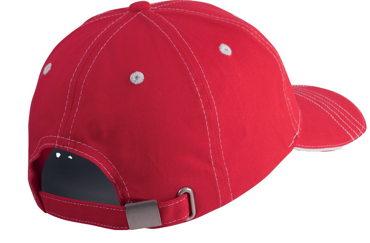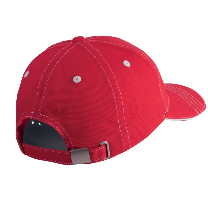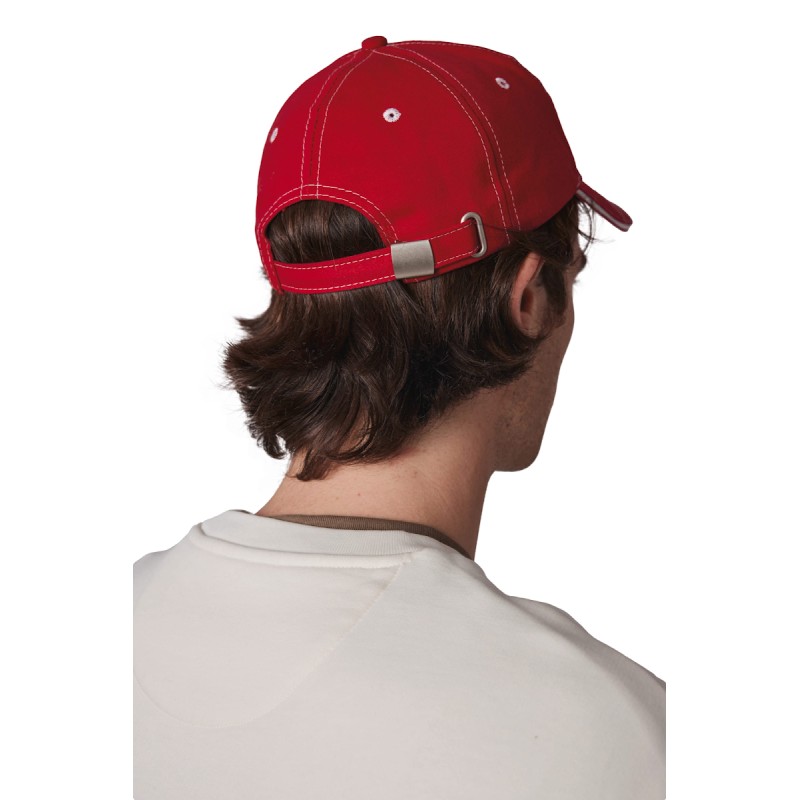 100% coton sergé brossé. 6 panneaux. Œillets et surpiqûres contrastés. Bande de transpiration en coton. Fermeture réglable par boucle métallique.