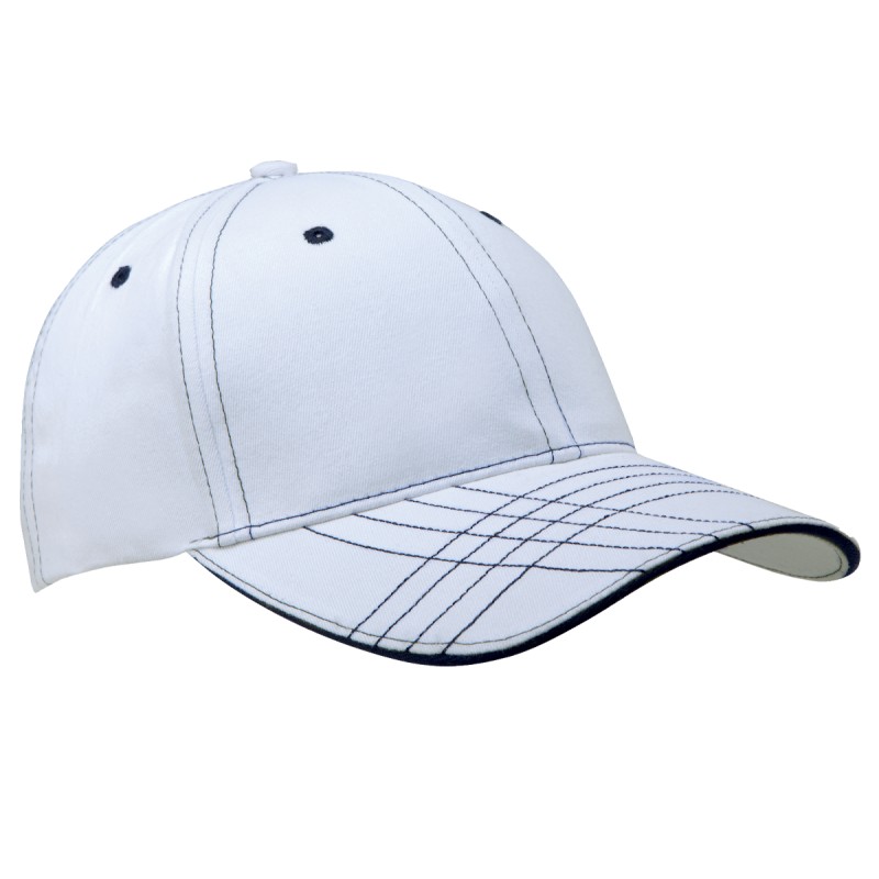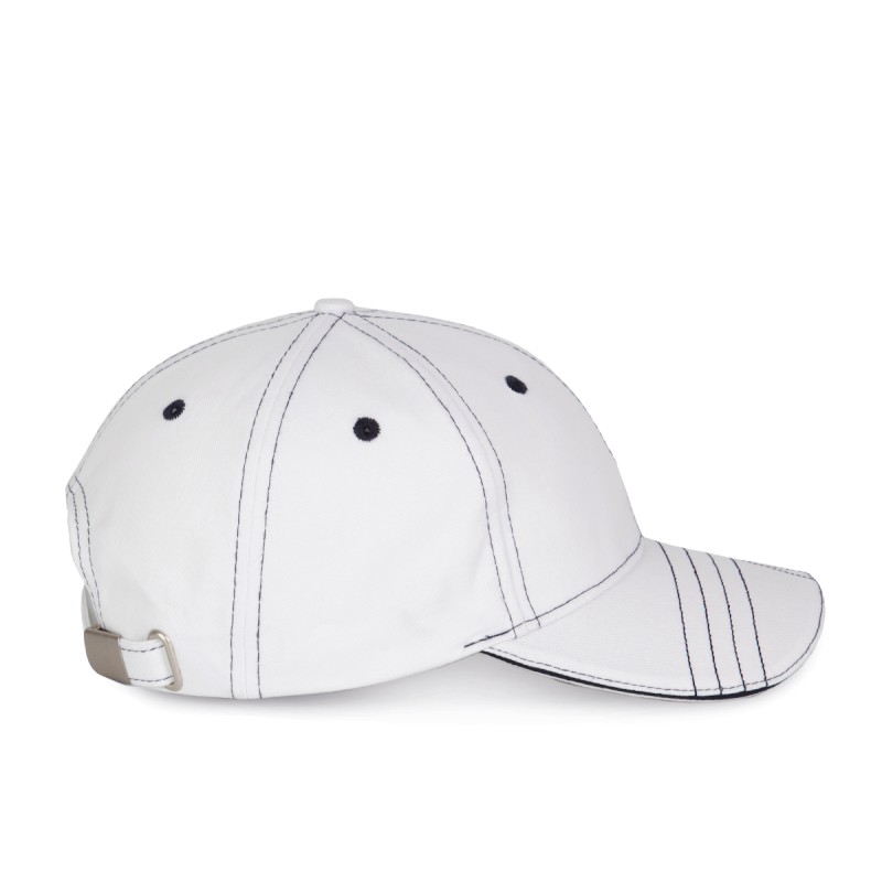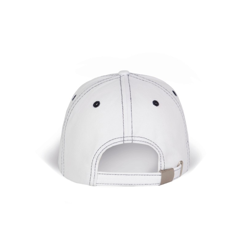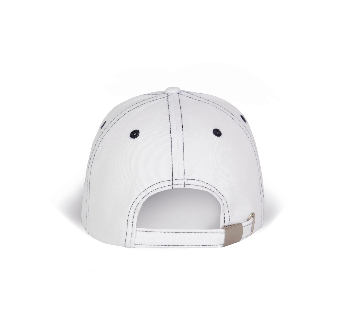 100% coton sergé brossé. 6 panneaux. Œillets et surpiqûres contrastés. Bande de transpiration en coton. Fermeture réglable par boucle métallique.