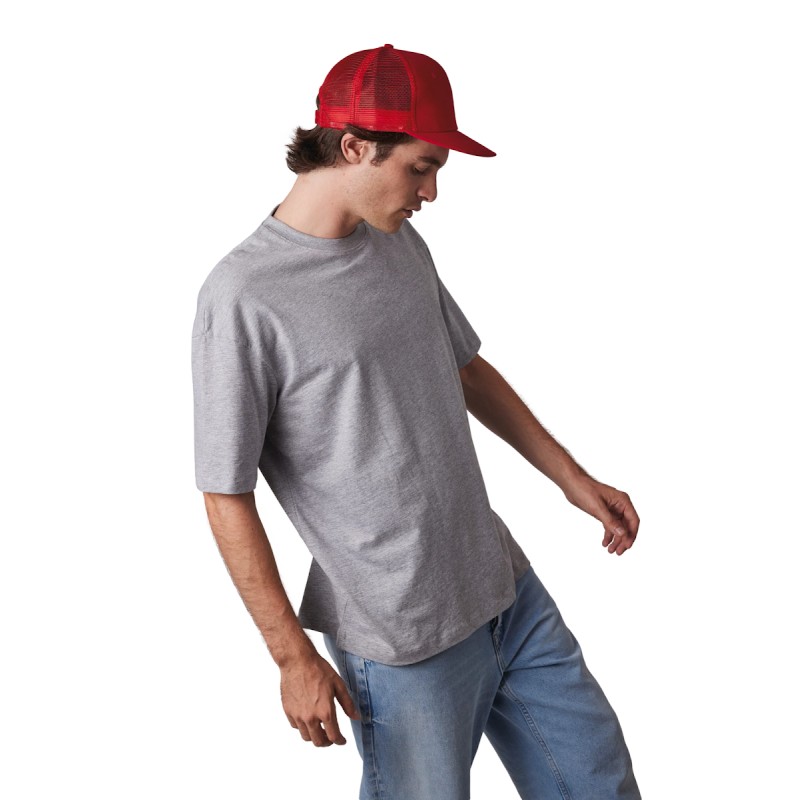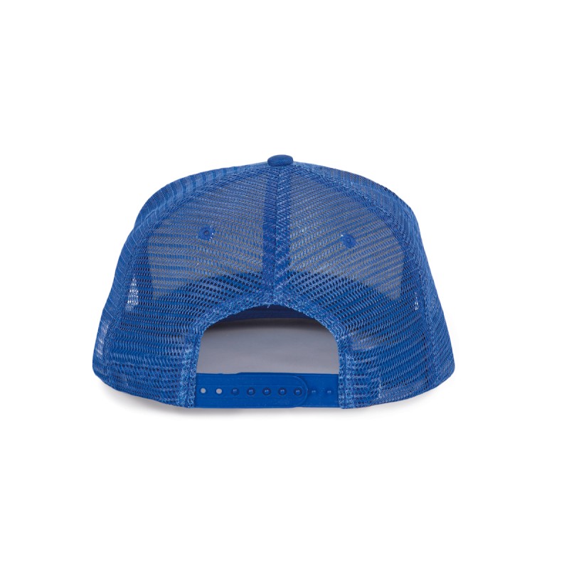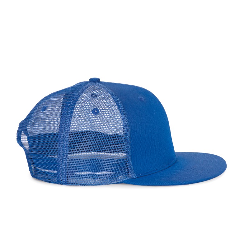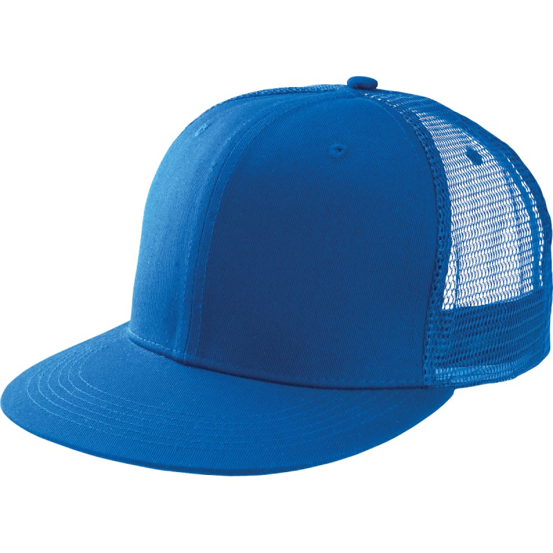 Casquette 6 panneaux 100% coton et filet 100% polyester. Visière plate. Bande de transpiration doublée en coton. Languette de réglage en plastique.