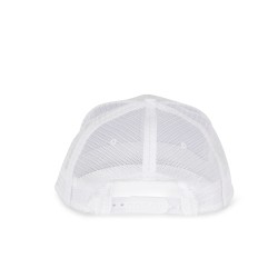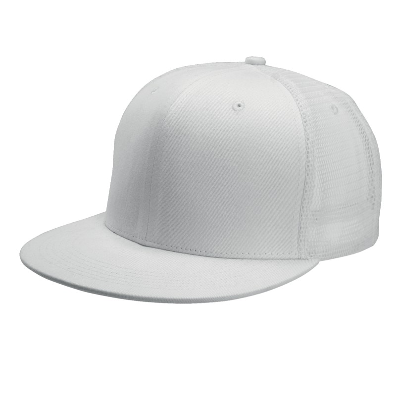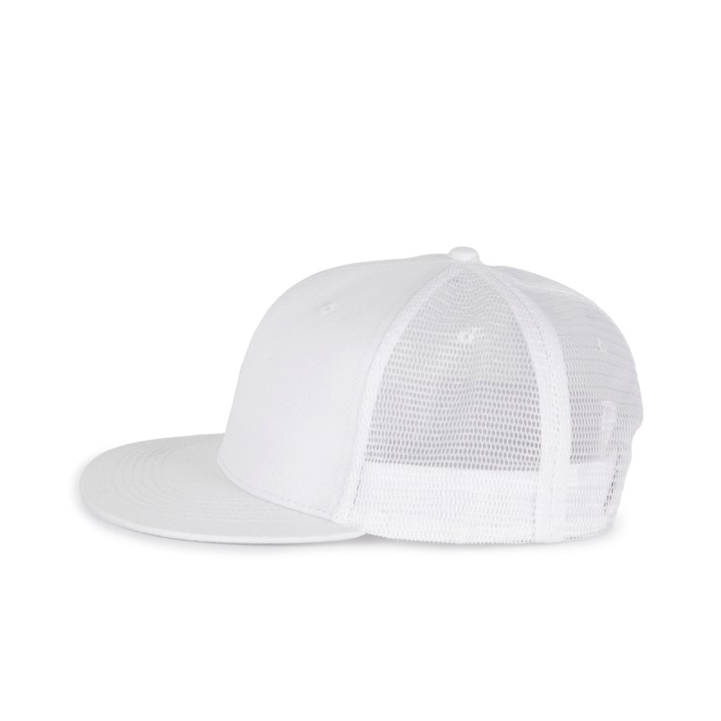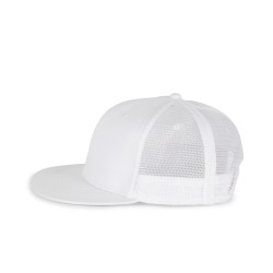 Casquette 6 panneaux 100% coton et filet 100% polyester. Visière plate. Bande de transpiration doublée en coton. Languette de réglage en plastique.