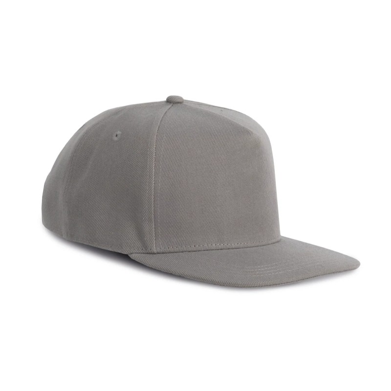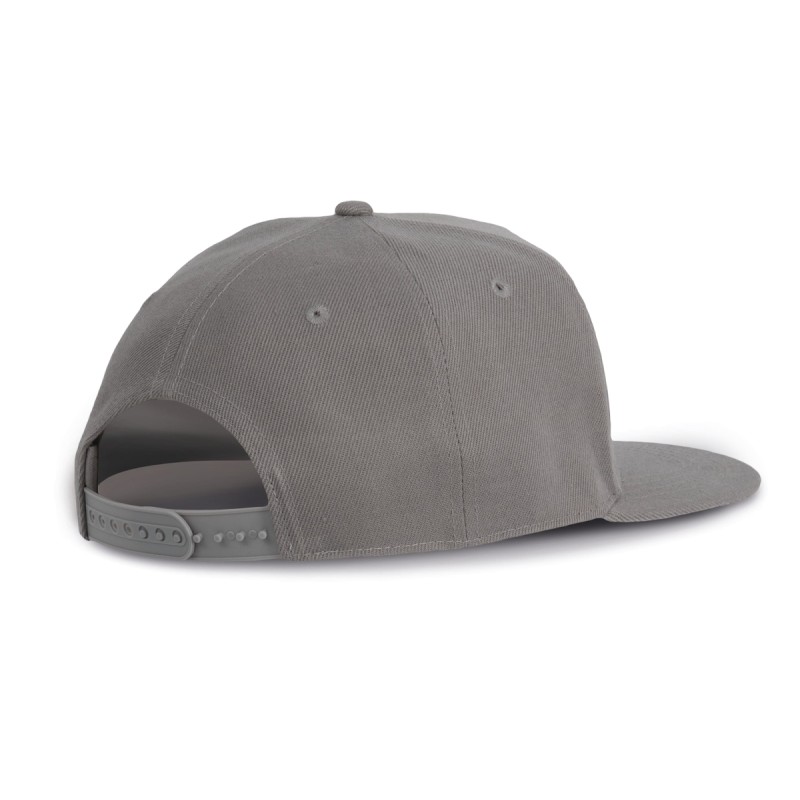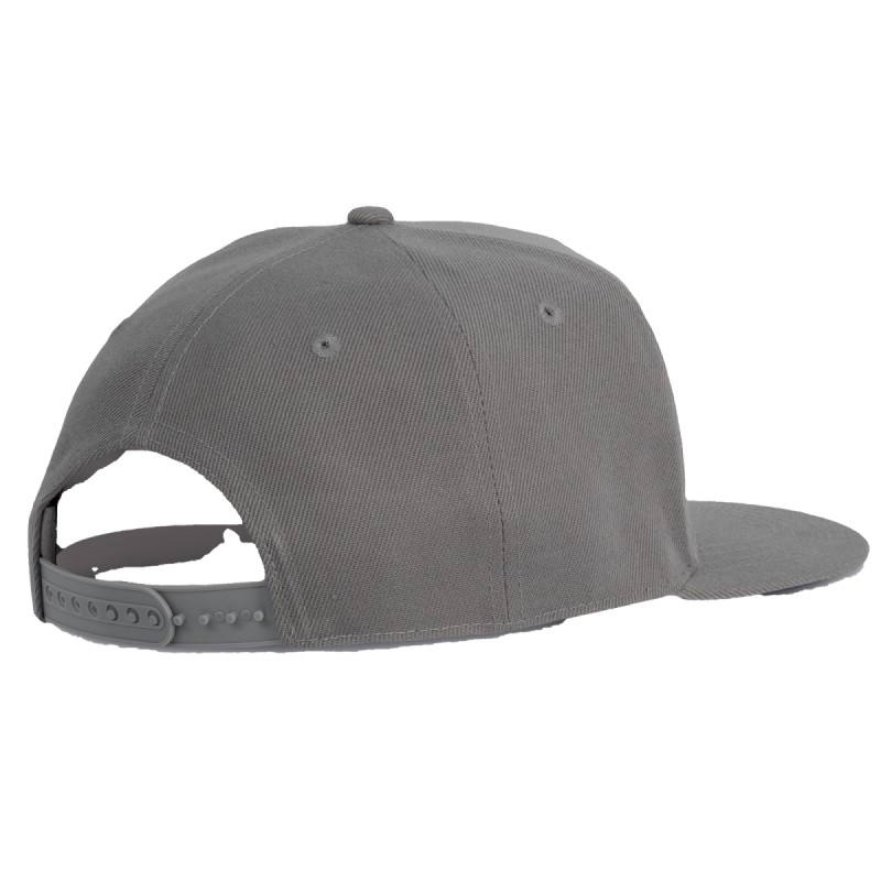 100% polyester. Casquette Snapback 5 panneaux. Visière droite et profil haut. Dotée d'une languette de réglage en plastique.