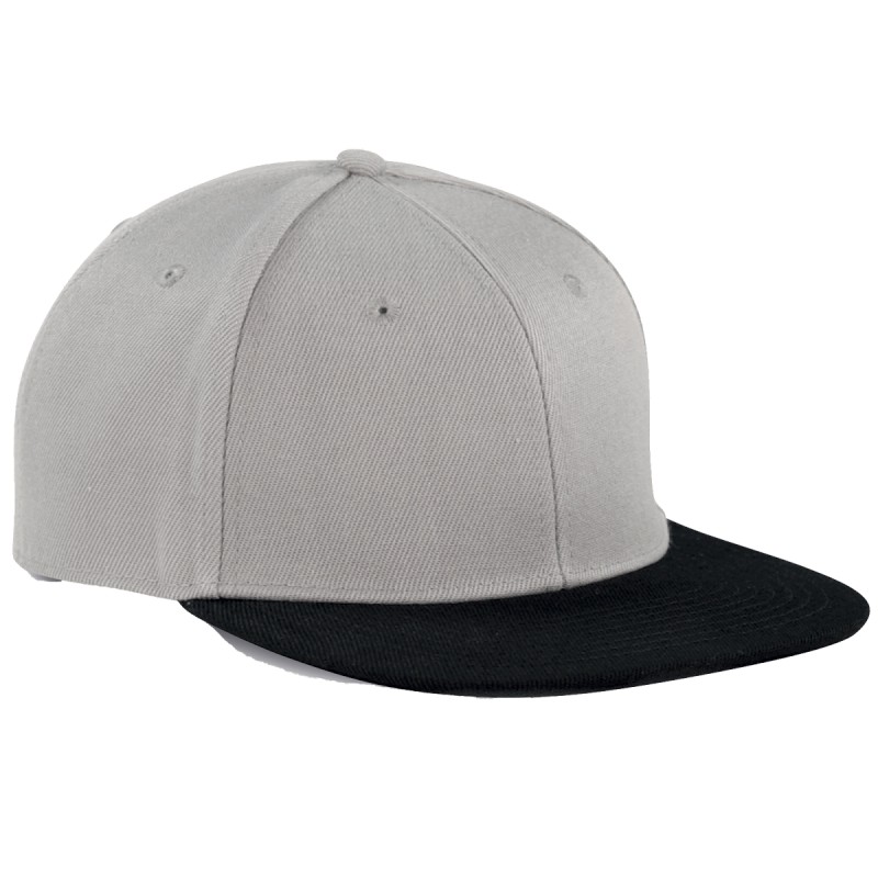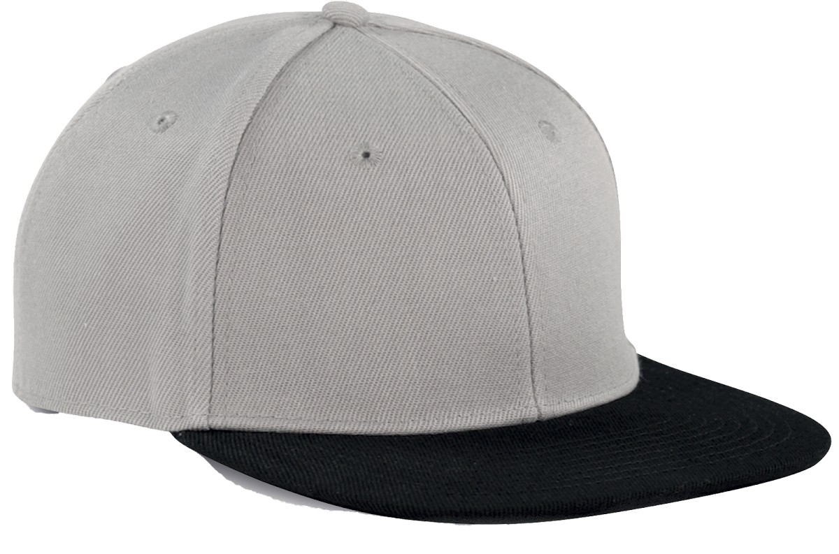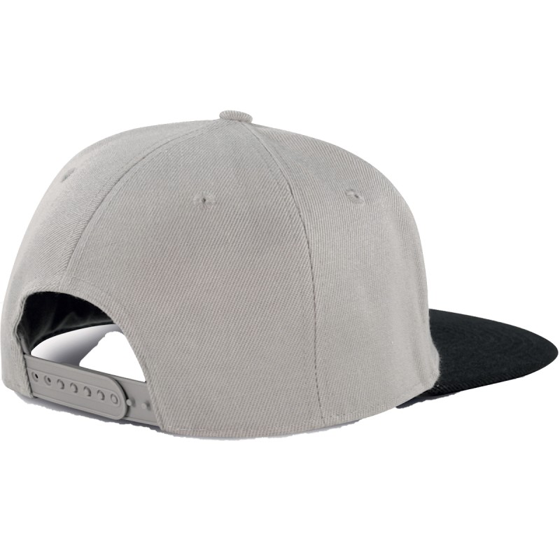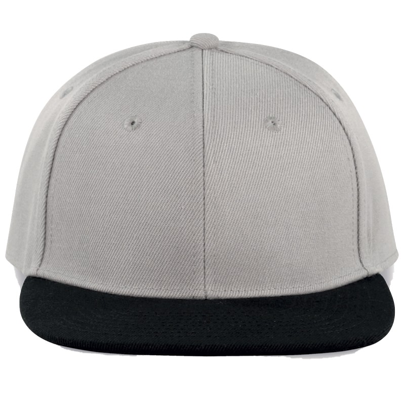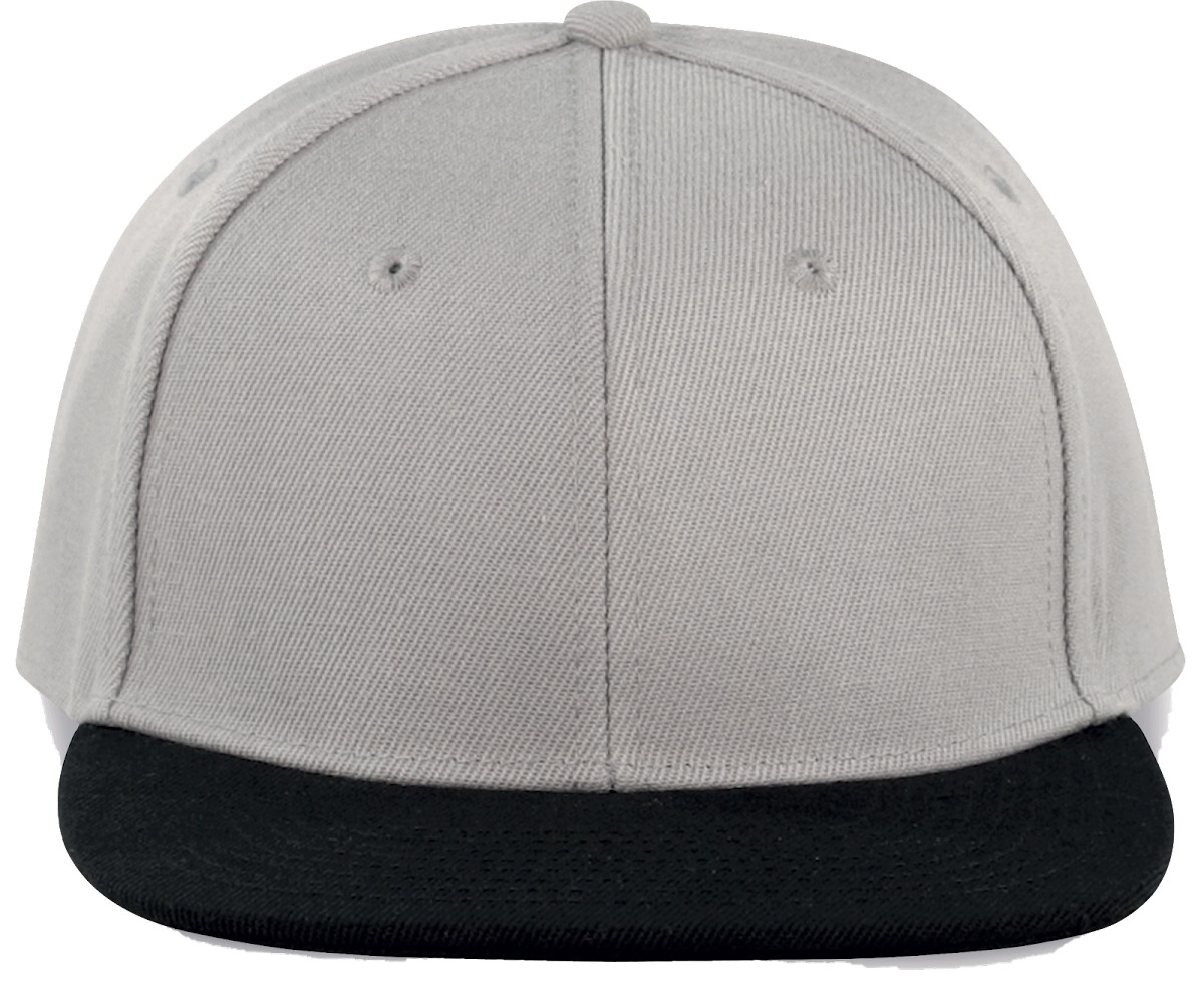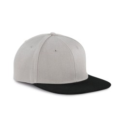 100% polyester. Casquette Snapback 6 panneaux. Visière plate et profil haut. Languette de réglage en plastique.