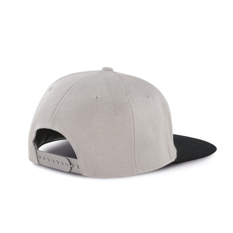 100% polyester. Casquette Snapback 6 panneaux. Visière plate et profil haut. Languette de réglage en plastique.