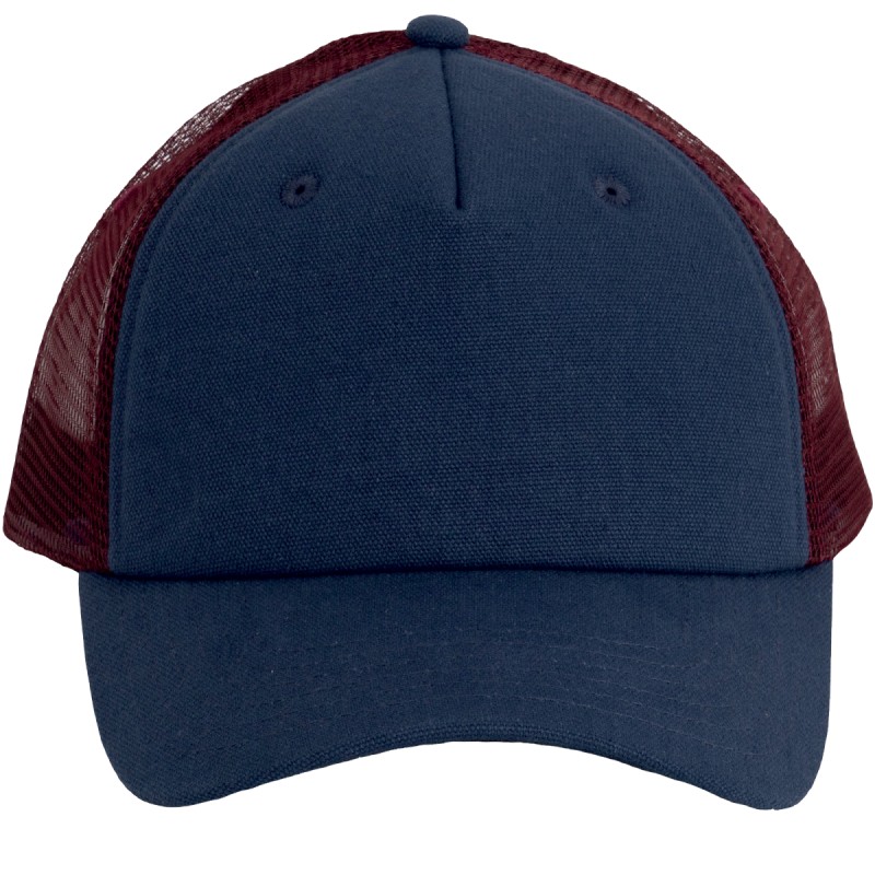 100% coton. Casquette style trucker 5 panneaux. Panneaux avant et visière en coton canvas et maille de filet en polyester. Languette de réglage en plastique.