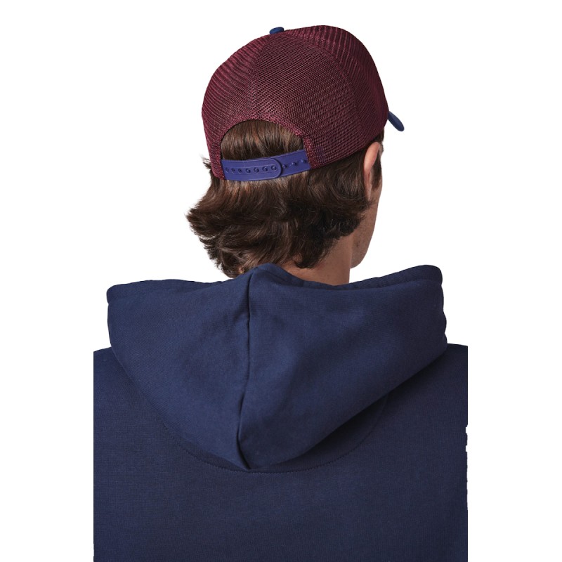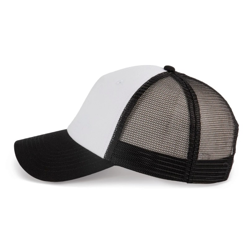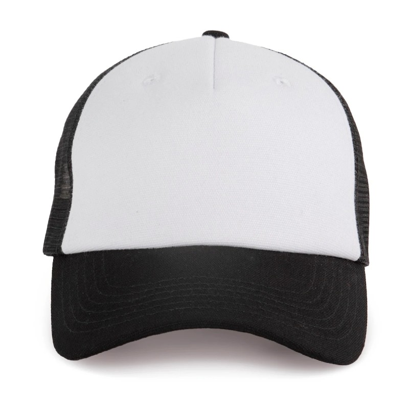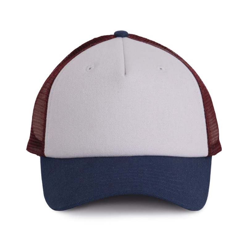 100% coton. Casquette style trucker 5 panneaux. Panneaux avant et visière en coton canvas et maille de filet en polyester. Languette de réglage en plastique.