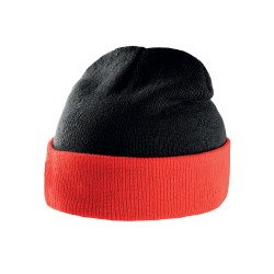 100% acrylique. Bonnet tricoté avec revers de couleur contrastée.