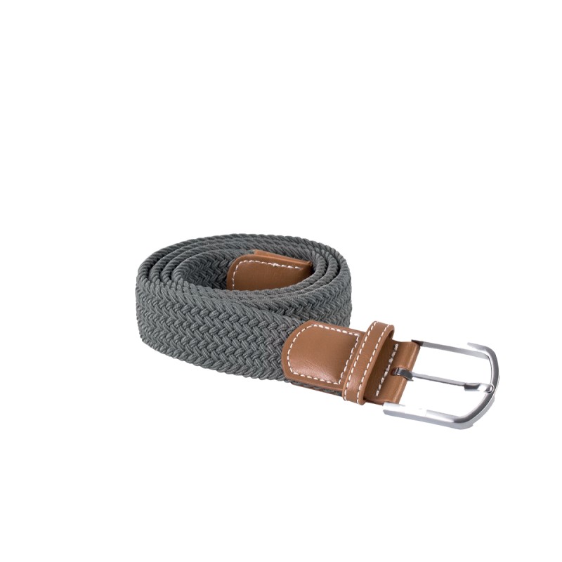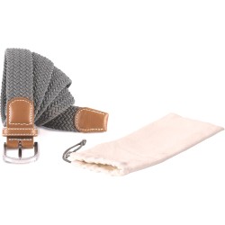 Ceinture tressée avec boucle métallique. La composition élastique 52% caoutchouc et 48% polypropylène, tissée et tressée permet la circulation de l'air. Finition passants en polyuréthanne, avec surpiqures contrastées. Livrée dans sa pochette en coton.