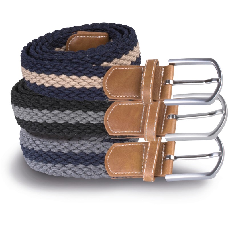 Ceinture tressée avec boucle métallique. La composition élastique 52% caoutchouc et 48% polypropylène, tissée et tressée permet la circulation de l'air. Finition passants en polyuréthanne, avec surpiqures contrastées. Livrée dans sa pochette en coton.