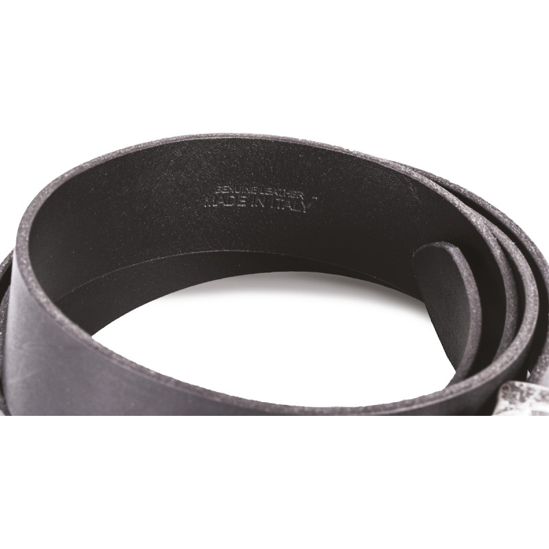 100% cuir. Croûte de cuir de bovin pleine fleur, finition ainiline. Ceinture à bord franc fabriquée en Italie. Épaisseur : 35 mm. Longueur totale de la ceinture : 125 cm. S'adapte de la taille XS jusqu'à XXL en la coupant par la longueur car la boucle est détachable. Livrée dans sa pochette en coton, afin de faciliter la personnalisation.