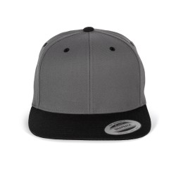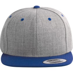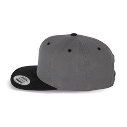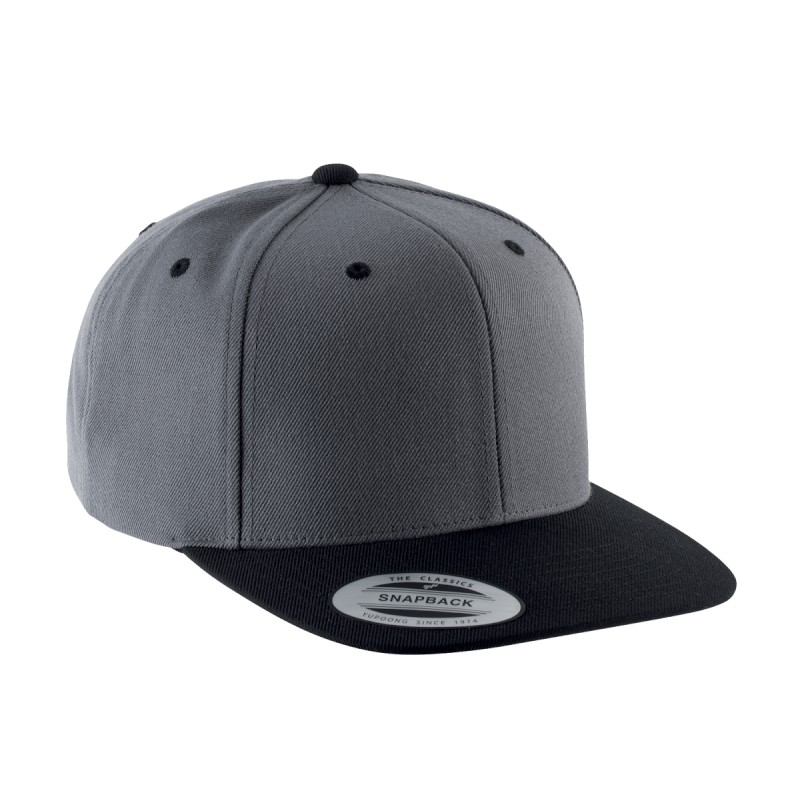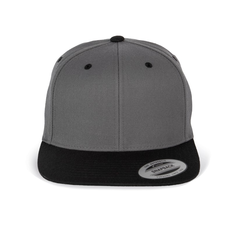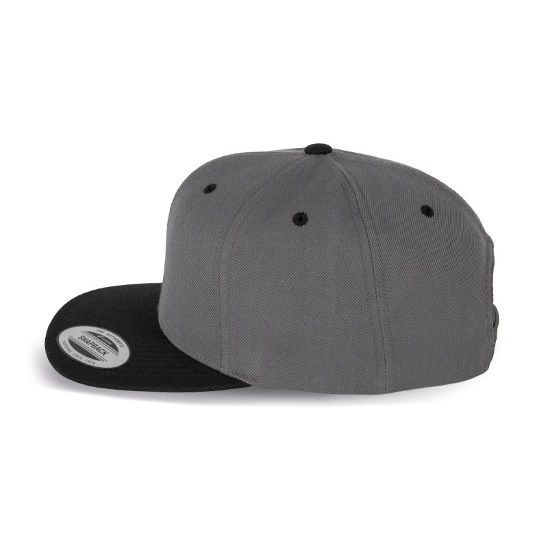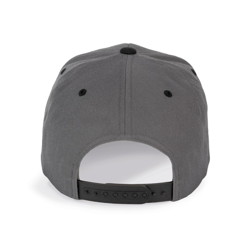 80% acrylique / 20% laine. 6 panneaux. Modèle classique de première qualité. Visière plate, profil haut, panneaux avants rigidifiés. Dessous de visière contrasté de couleur verte. Languette de réglage en plastique.
