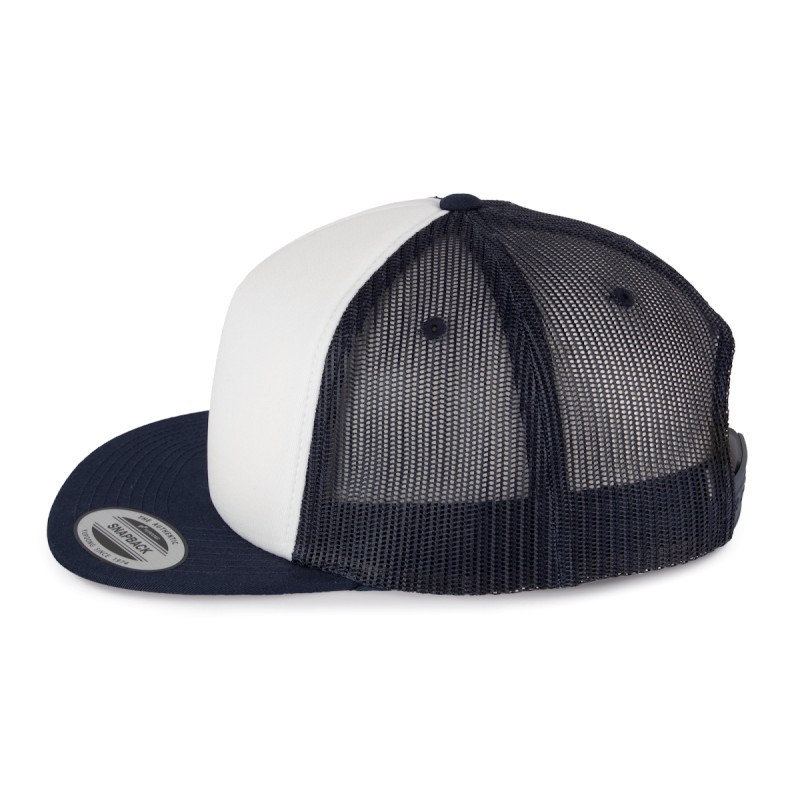 60% coton / 40% polyester. 5 panneaux. Modèle Trucker classique avec mousse de haute qualité. Enduction spongieuse sur panneau avant (ép. 6mm), idéal pour l'impression ou la broderie. Languette de réglage en plastique.