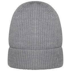 100% laine mérinos responsable RWS (Responsible Wool Standard). Fil peigné. Jauge 7. Tricotage en côte 1 x 1. Bonnet à large revers. Poids moyen : 80 g.