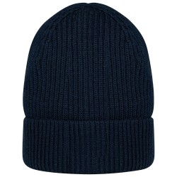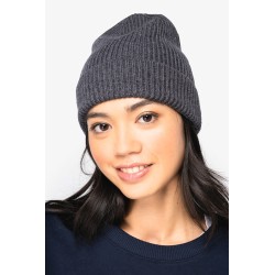 100% laine mérinos responsable RWS (Responsible Wool Standard). Fil peigné. Jauge 7. Tricotage en côte 1 x 1. Bonnet à large revers. Poids moyen : 80 g.