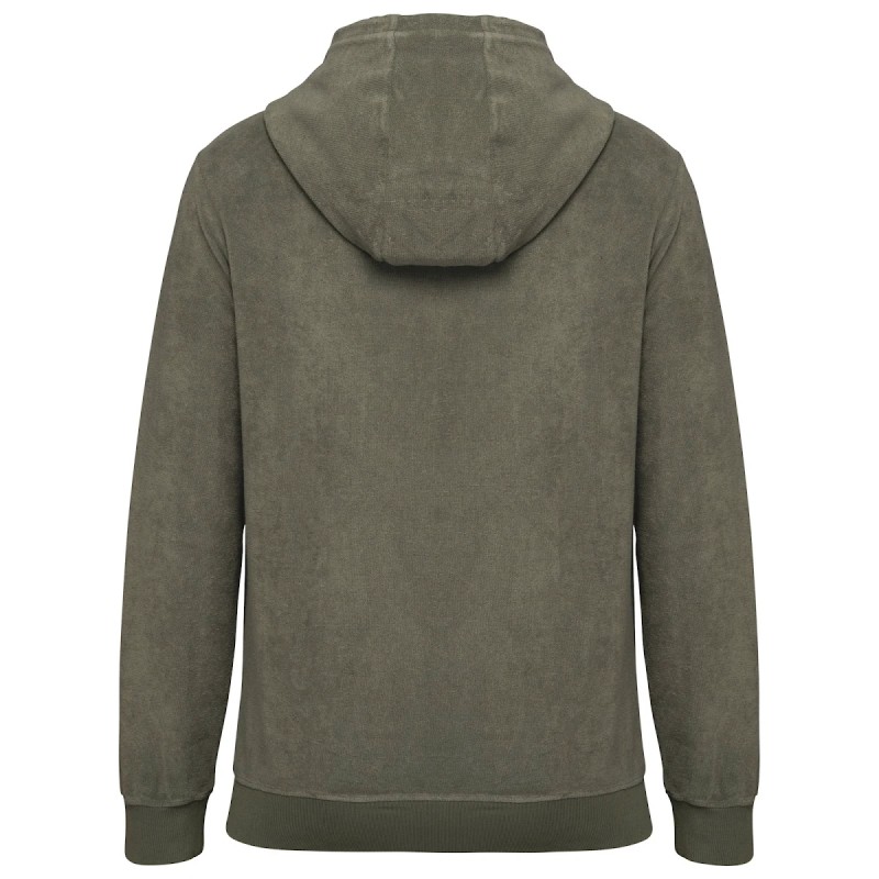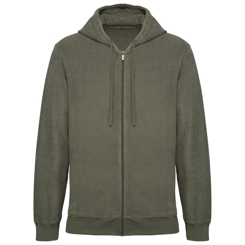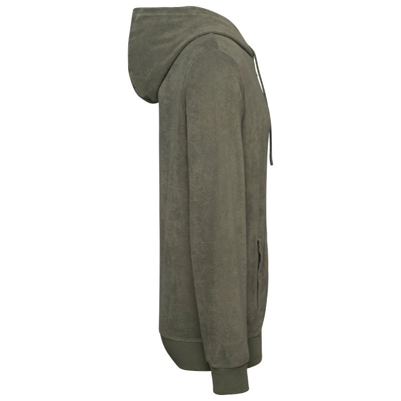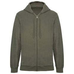 80% coton biologique / 20% polyester recyclé post-consumer. Fabriqué au Portugal. Coton peigné. Matière éponge. Lavé aux enzymes. Coupe ajustée. Capuche 3 panneaux doublée en matière principale. Zip en nylon et tirette en métal recyclé ton sur ton. Deux poches passepoilées devant avec piqûre nervure. Bord côte 1 x 1 bas de manches et de vêtement. Finition encolure bande de propreté en chevrons ton sur ton. Œillets brodés. Cordon de serrage rond en coton biologique et embout en silicone ton sur ton. Encolure, bas de manches et de vêtement avec surpiqûre. Renfort épaules. Demi-lune lune au dos.