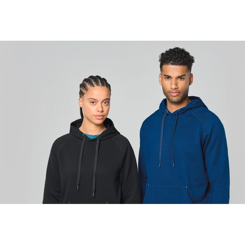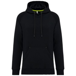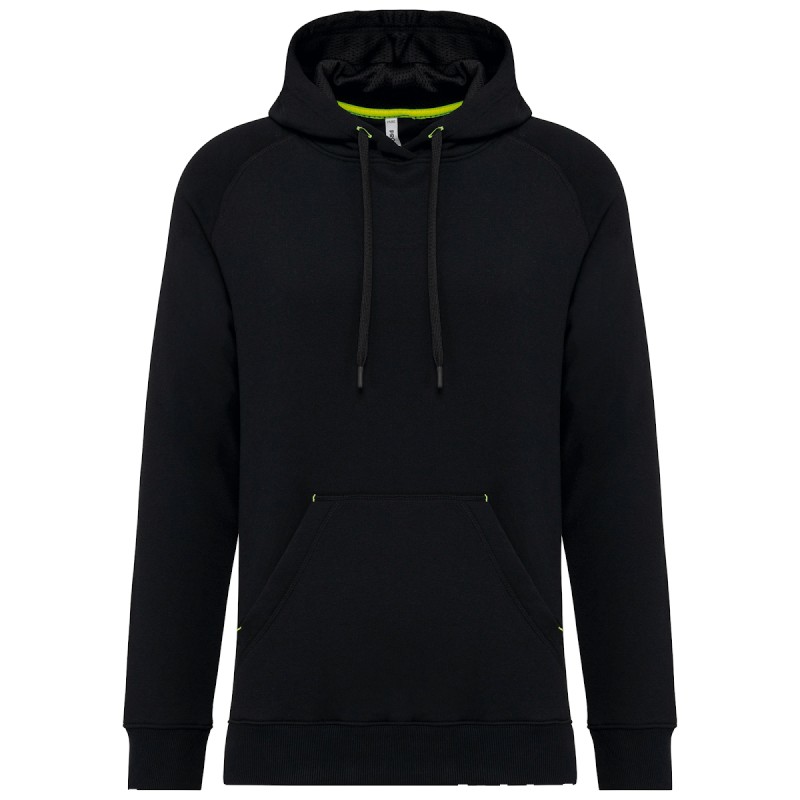 65% polyester /35% coton. Fil Vortex. Molleton gratté. Coton peigné. Coupe ajustée. Manches raglan. Capuche doublée en maille filet ton sur ton. Bande de propreté à l'intérieur de la capuche, œillets du cordon de la capuche et points d'arrêts sur les poches en coloris fluorescent. Poches kangourou avec 1 poche pour téléphone fluorescente. Poignets et bas de vêtement en bord-côte double épaisseur 2x2. Finition demi-lune encolure au dos pour faciliter la personnalisation de marque à l'intérieur. Etiquette de marque Tear-away.