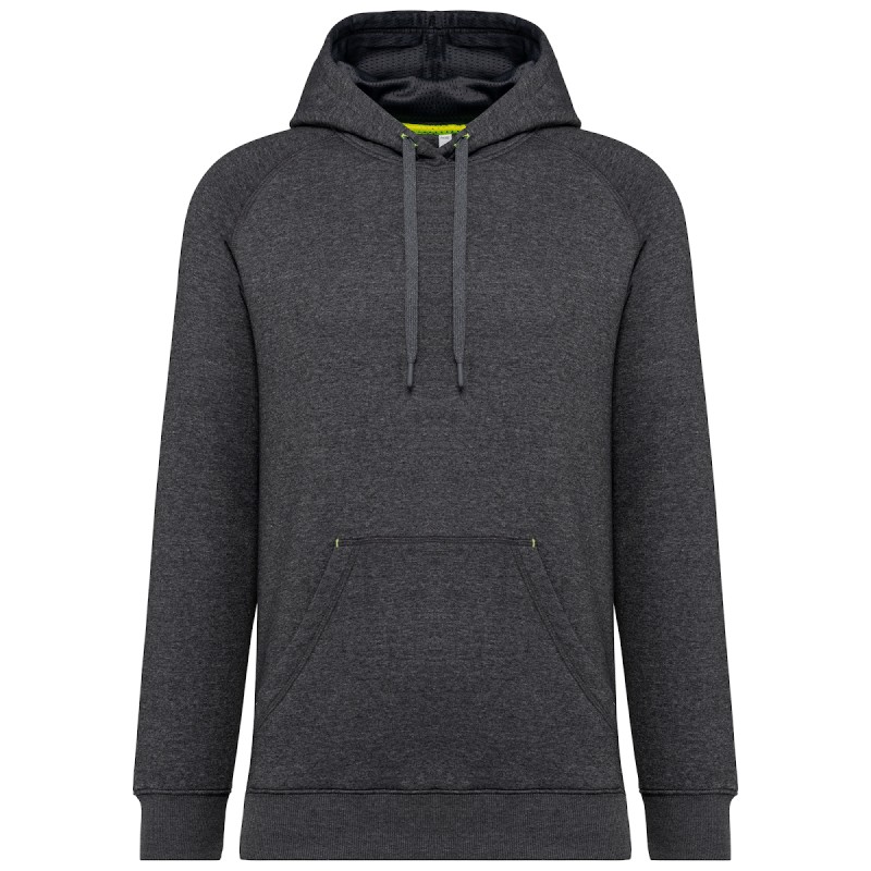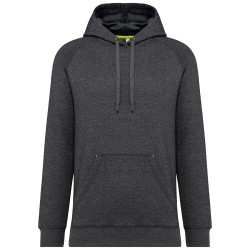 65% polyester /35% coton. Fil Vortex. Molleton gratté. Coton peigné. Coupe ajustée. Manches raglan. Capuche doublée en maille filet ton sur ton. Bande de propreté à l'intérieur de la capuche, œillets du cordon de la capuche et points d'arrêts sur les poches en coloris fluorescent. Poches kangourou avec 1 poche pour téléphone fluorescente. Poignets et bas de vêtement en bord-côte double épaisseur 2x2. Finition demi-lune encolure au dos pour faciliter la personnalisation de marque à l'intérieur. Etiquette de marque Tear-away.