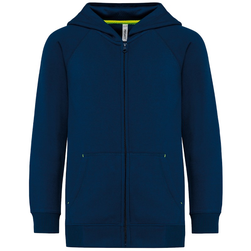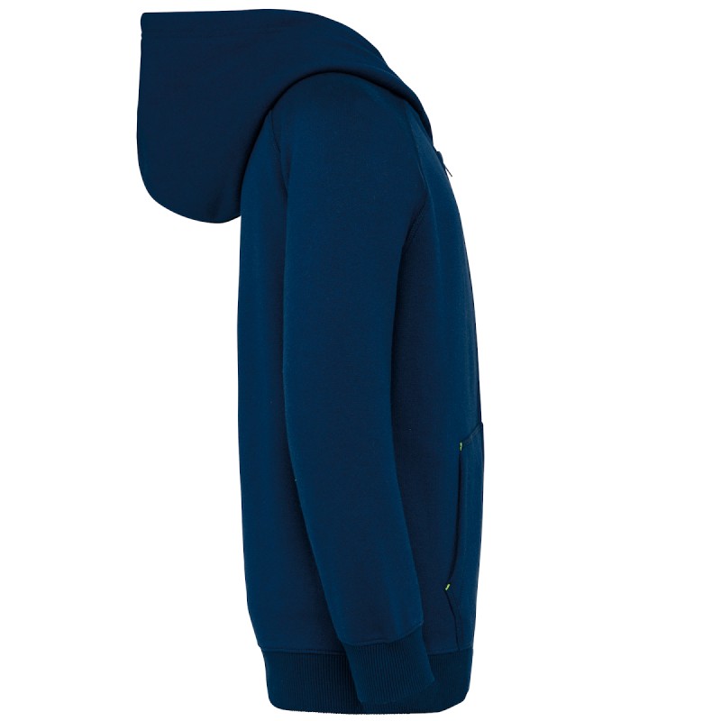 65% polyester/ 35% coton. Molleton gratté. Coton peigné. Fil Vortex. Coupe ajustée. Manches raglan. Fermeture zip nylon. Capuche doublée en maille filet ton sur ton. Bande de propreté à l'intérieur de la capuche et points d'arrêts sur les poches en coloris fluorescent. Poches kangourou avec 1 poche pour téléphone fluorescente. Poignets et bas de vêtement en bord-côte double épaisseur 2x2. Finition demi-lune encolure au dos pour faciliter la personnalisation de marque à l'intérieur. Etiquette de marque Tear-away.