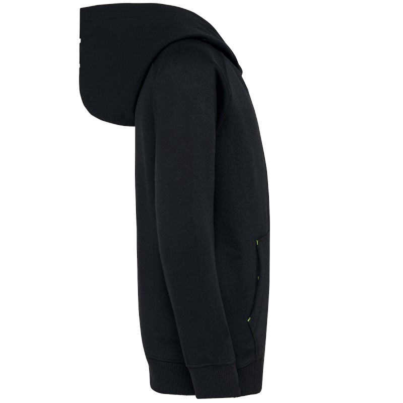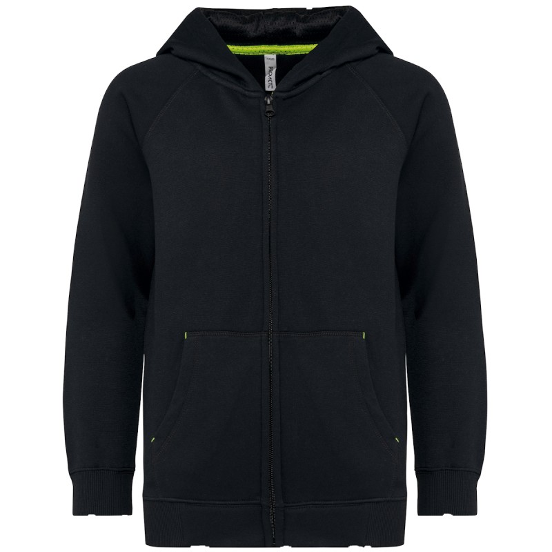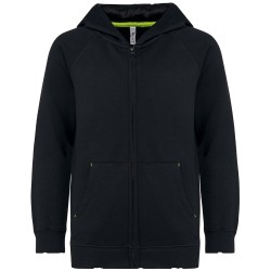 65% polyester/ 35% coton. Molleton gratté. Coton peigné. Fil Vortex. Coupe ajustée. Manches raglan. Fermeture zip nylon. Capuche doublée en maille filet ton sur ton. Bande de propreté à l'intérieur de la capuche et points d'arrêts sur les poches en coloris fluorescent. Poches kangourou avec 1 poche pour téléphone fluorescente. Poignets et bas de vêtement en bord-côte double épaisseur 2x2. Finition demi-lune encolure au dos pour faciliter la personnalisation de marque à l'intérieur. Etiquette de marque Tear-away.