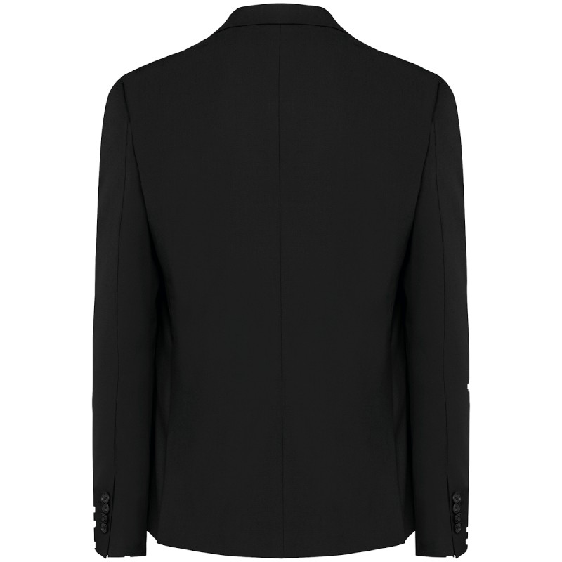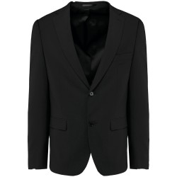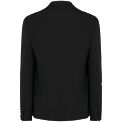 50% polyester / 23% viscose / 22% laine / 5% élasthanne. Doublure en twill (100% polyester) ton sur ton ton. Coupe ajustée. Veste à deux boutons ton sur ton. Deux poches passepoilées avec rabats, ainsi qu'une poche poitrine passepoilée côté cœur. Fausse boutonnière ton sur ton sur revers de col. Empiècement côté qui vient donner la forme au produit. Bride de suspension en satin à l'encolure. Couture milieu dos avec deux fentes bas de vêtement. Bas de manches avec fausse fente à 4 boutons ton sur ton. Finition avec un biais contrasté, pour les deux poches poitrines intérieures. Une poche téléphone et une poche ticket passepoilées ton sur ton intérieur gauche du vêtement au porté. Zip de personnalisation côté gauche au porté. Pas d'étiquette de marque, uniquement une puce de taille pour faciliter la personnalisation.