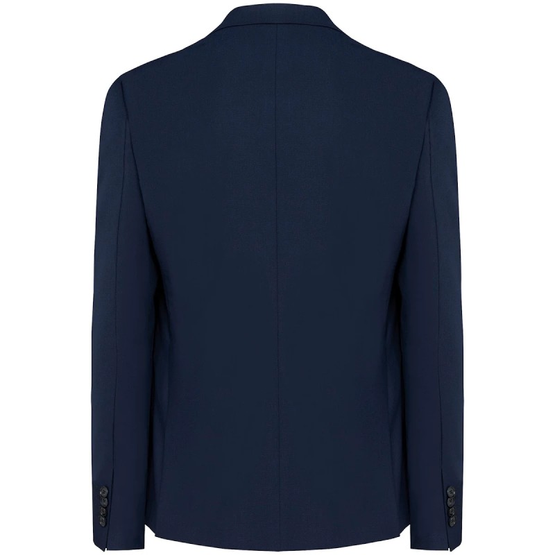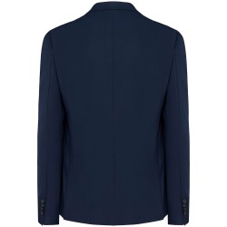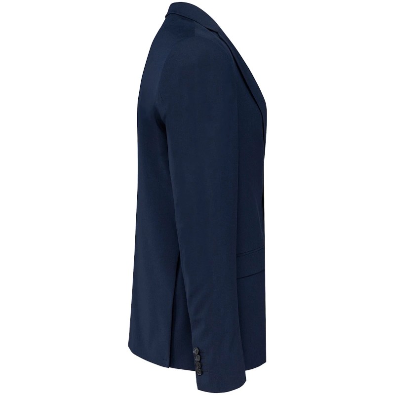 50% polyester / 23% viscose / 22% laine / 5% élasthanne. Doublure en twill (100% polyester) ton sur ton ton. Coupe ajustée. Veste à deux boutons ton sur ton. Deux poches passepoilées avec rabats, ainsi qu'une poche poitrine passepoilée côté cœur. Fausse boutonnière ton sur ton sur revers de col. Empiècement côté qui vient donner la forme au produit. Bride de suspension en satin à l'encolure. Couture milieu dos avec deux fentes bas de vêtement. Bas de manches avec fausse fente à 4 boutons ton sur ton. Finition avec un biais contrasté, pour les deux poches poitrines intérieures. Une poche téléphone et une poche ticket passepoilées ton sur ton intérieur gauche du vêtement au porté. Zip de personnalisation côté gauche au porté. Pas d'étiquette de marque, uniquement une puce de taille pour faciliter la personnalisation.