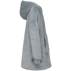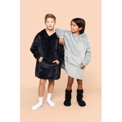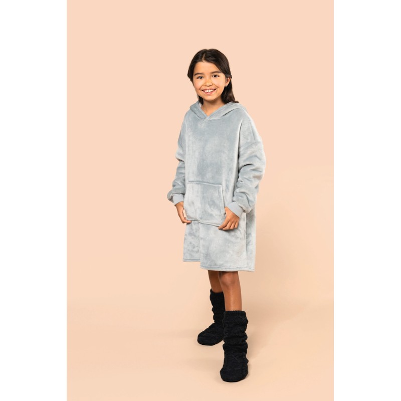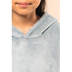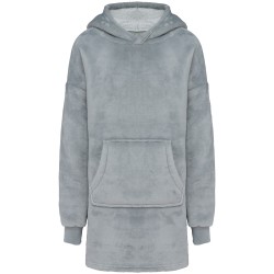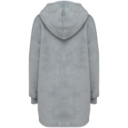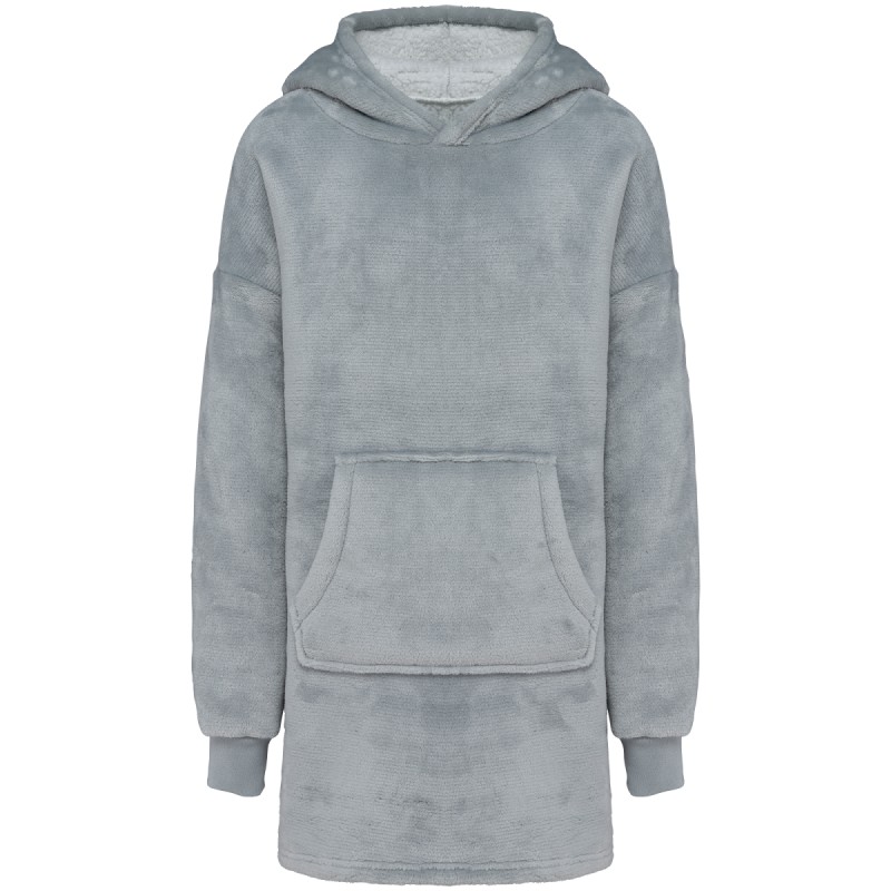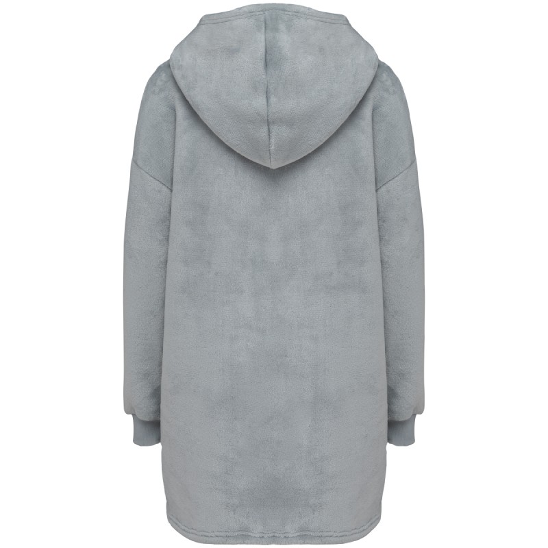 100% polyester. Coupe oversize aux épaules tombantes. Tissu double face, extérieur velours avec intérieur sherpa. Capuche croisée devant en deux panneaux avec finitions double surpiqûre. Manches longues avec poignet bord côte 1x1 doublé en finition tubulaire pour une meilleure finition. Présence d'élasthanne dans le bord côte bas de manche pour éviter que le poignet se déforme. Poche kangourou. Finition bas de vêtement double surpiqûre. Pas d'étiquette de marque au col, uniquement une puce de taille déchirable pour faciliter la personnalisation.