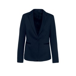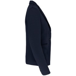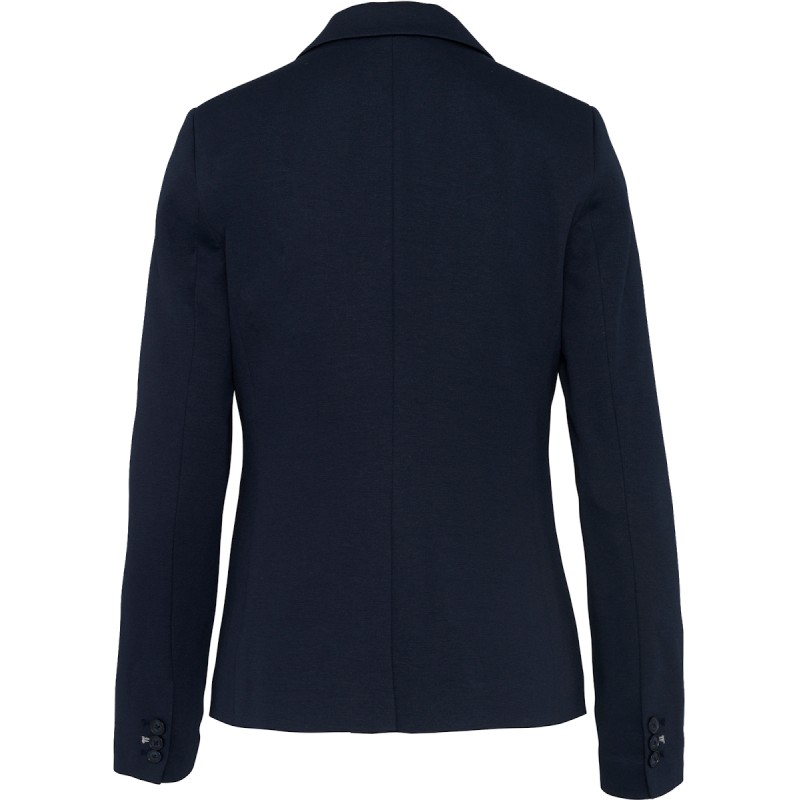 80% polyester / 18% coton / 2% élasthanne (Night navy heather) - 74% polyester / 24% viscose / 2% élasthane (Light grey heather). Maille interlock. Doublure corps en polycoton et manches en taffetas polyester. Veste 1 bouton. 2 poches passepoilées devant. 1 poche intérieure boutonnée. Liseré contrasté intérieur devant. Bas de manches avec 3 boutons dont 1 avec une boutonnière contrastée. 1 fente d'aisance au dos. 1 zip invisible intérieur côté coeur pour accès personnalisation.