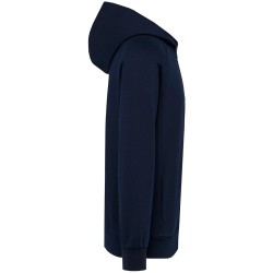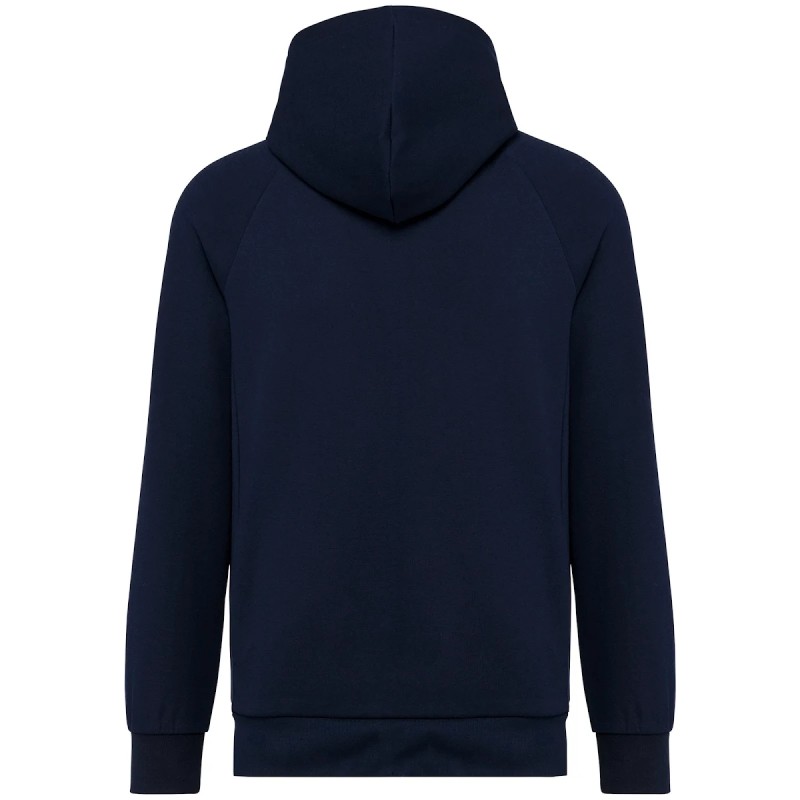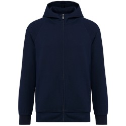70% coton / 26% polyester / 4% élasthanne. Coton peigné. Tissu interlock. Traitement LSI (Low Shrinkage Interlock). Capuche 2 panneaux, doublée dans le même tissu que le reste de la veste, pas de cordon. Surpiqûres au col. Bande de propreté sur l'encolure intérieure. Zip nylon ton sur ton avec zipper métal et finition bande de propreté à l'intérieur. Manches raglan. Rib 1x1. 2 poches prisent dans la couture de l'empiècement. Pas d'étiquette de marque, uniquement une puce de taille pour faciliter la personnalisation.