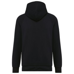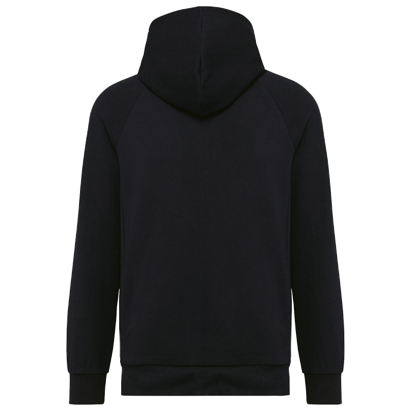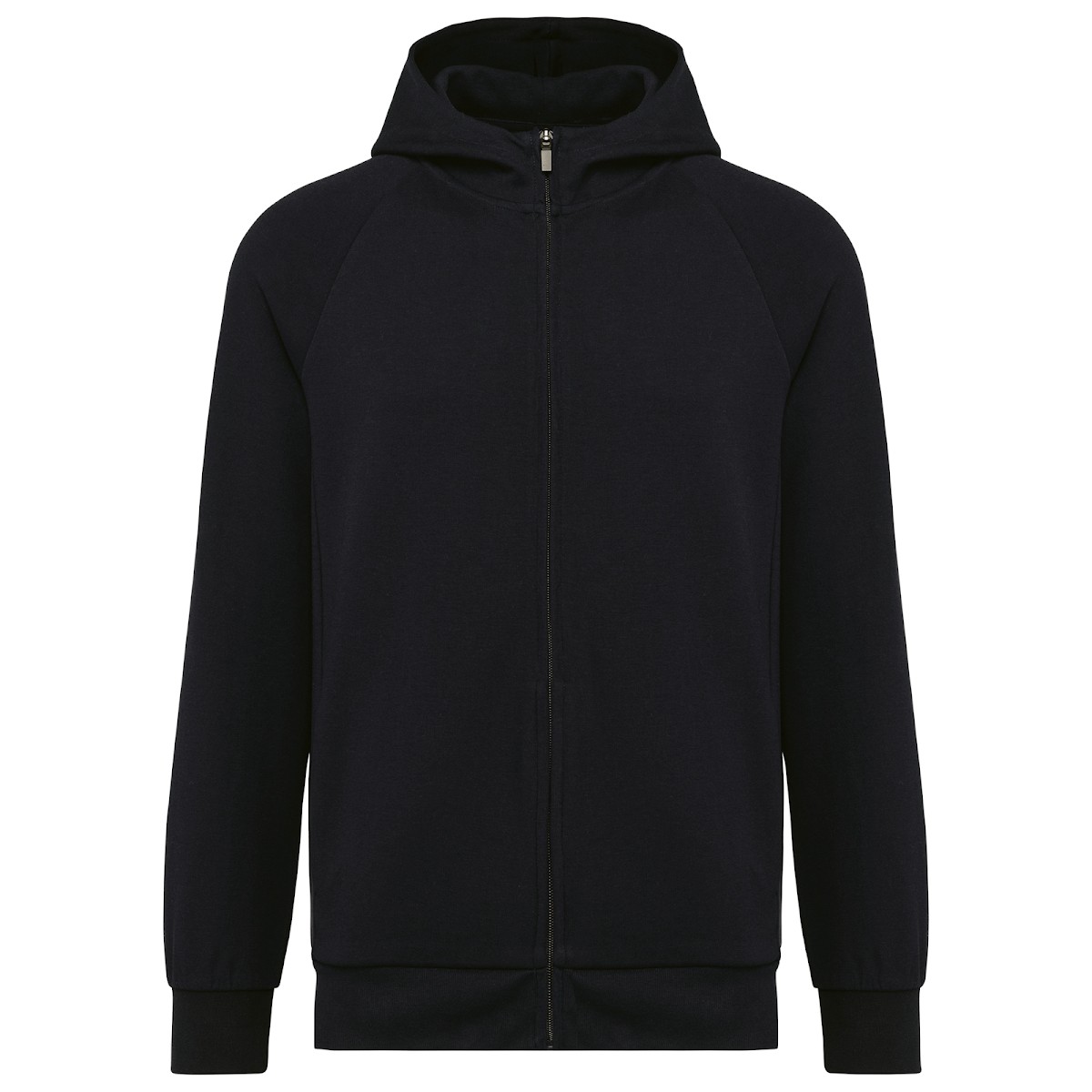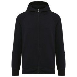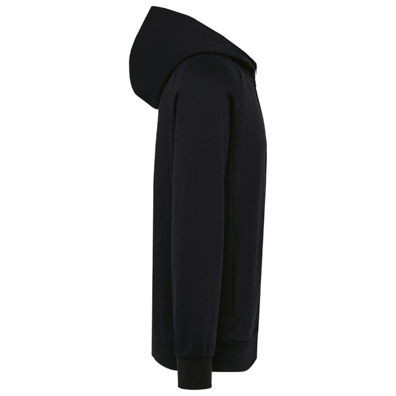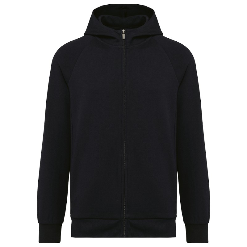 70% coton / 26% polyester / 4% élasthanne. Coton peigné. Tissu interlock. Traitement LSI (Low Shrinkage Interlock). Capuche 2 panneaux, doublée dans le même tissu que le reste de la veste, pas de cordon. Surpiqûres au col. Bande de propreté sur l'encolure intérieure. Zip nylon ton sur ton avec zipper métal et finition bande de propreté à l'intérieur. Manches raglan. Rib 1x1. 2 poches prisent dans la couture de l'empiècement. Pas d'étiquette de marque, uniquement une puce de taille pour faciliter la personnalisation.