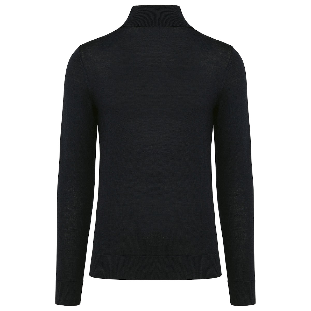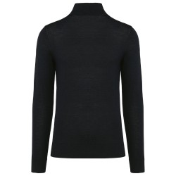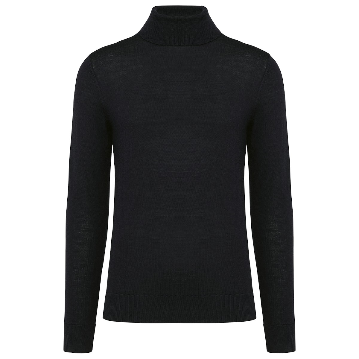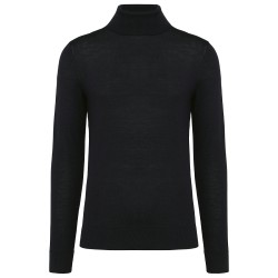 100% Mérinos. Laine extra-fine peignée. Jauge 14. Fully-fashioned : tricoté dans la forme et assemblé sur machine de remaillage. Col roulé, poignets et bas du vêtement rib 1 x 1.
