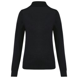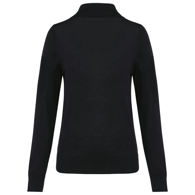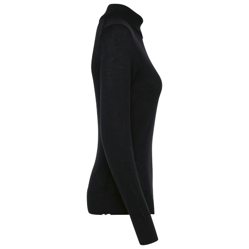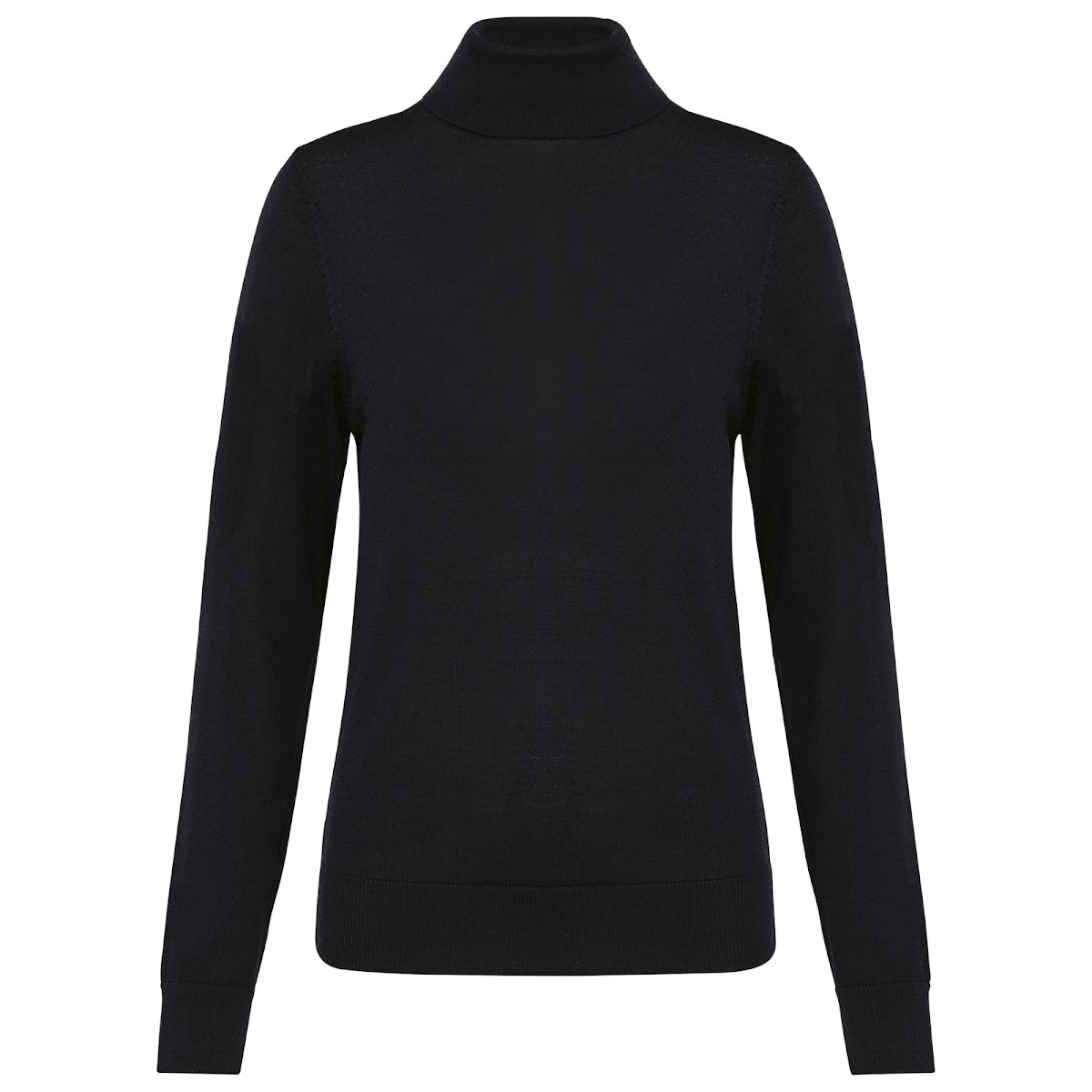 100% Mérinos. Laine extra-fine peignée. Jauge 14. Fully-fashioned : tricoté dans la forme et assemblé sur machine de remaillage. Col roulé, poignets et bas du vêtement rib 1 x 1.