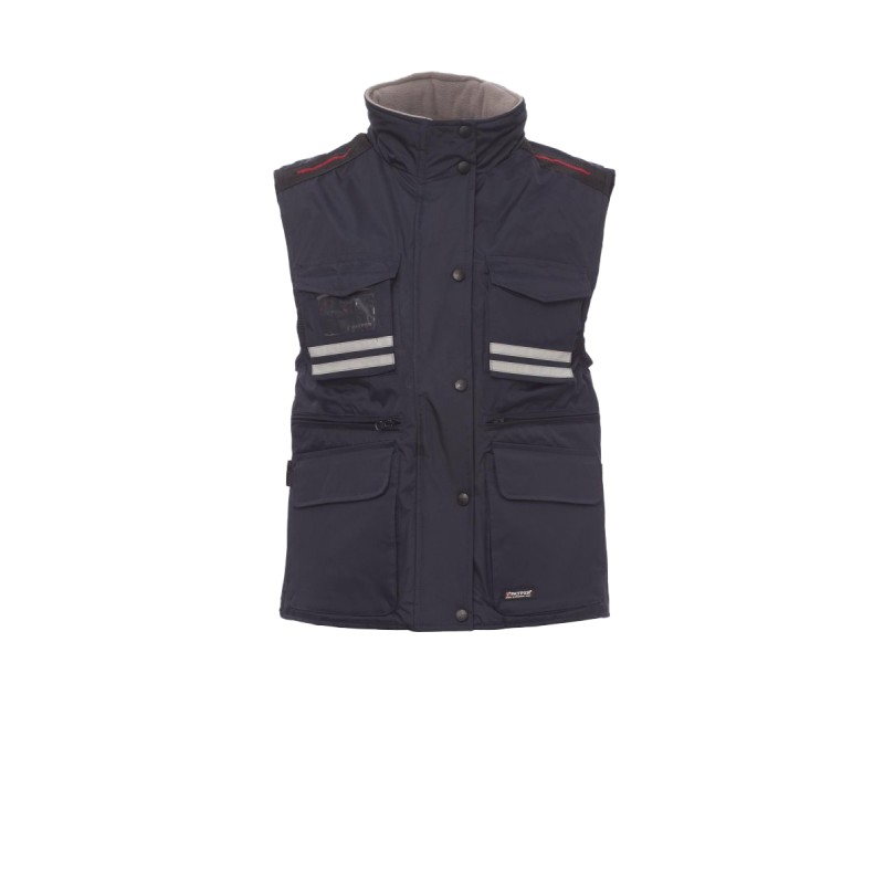 Gilet femme, coupe ergonomique, à zip de 8 mm en plastique avec curseur en métal, avec rabat et boutons en plastique, capuche profilée détachable et/ou repliable dans le col, passepoils réfléchissants gris devant et derrière, fente latérale à soufflet et zip, neuf poches extérieures dont deux LOCK SYSTEM, deux zippées et intérieur renforcé, une avec porte-badge réversible. Intérieur : rembourré, col, dos et chauffe-reins en micropolaire, coulisse à la taille et fermeture éclair intérieure pour faciliter impressions et broderies.