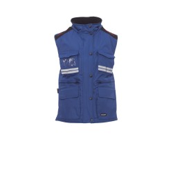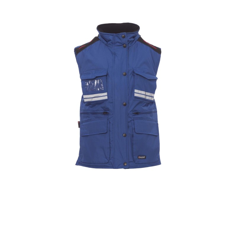 Gilet femme, coupe ergonomique, à zip de 8 mm en plastique avec curseur en métal, avec rabat et boutons en plastique, capuche profilée détachable et/ou repliable dans le col, passepoils réfléchissants gris devant et derrière, fente latérale à soufflet et zip, neuf poches extérieures dont deux LOCK SYSTEM, deux zippées et intérieur renforcé, une avec porte-badge réversible. Intérieur : rembourré, col, dos et chauffe-reins en micropolaire, coulisse à la taille et fermeture éclair intérieure pour faciliter impressions et broderies.